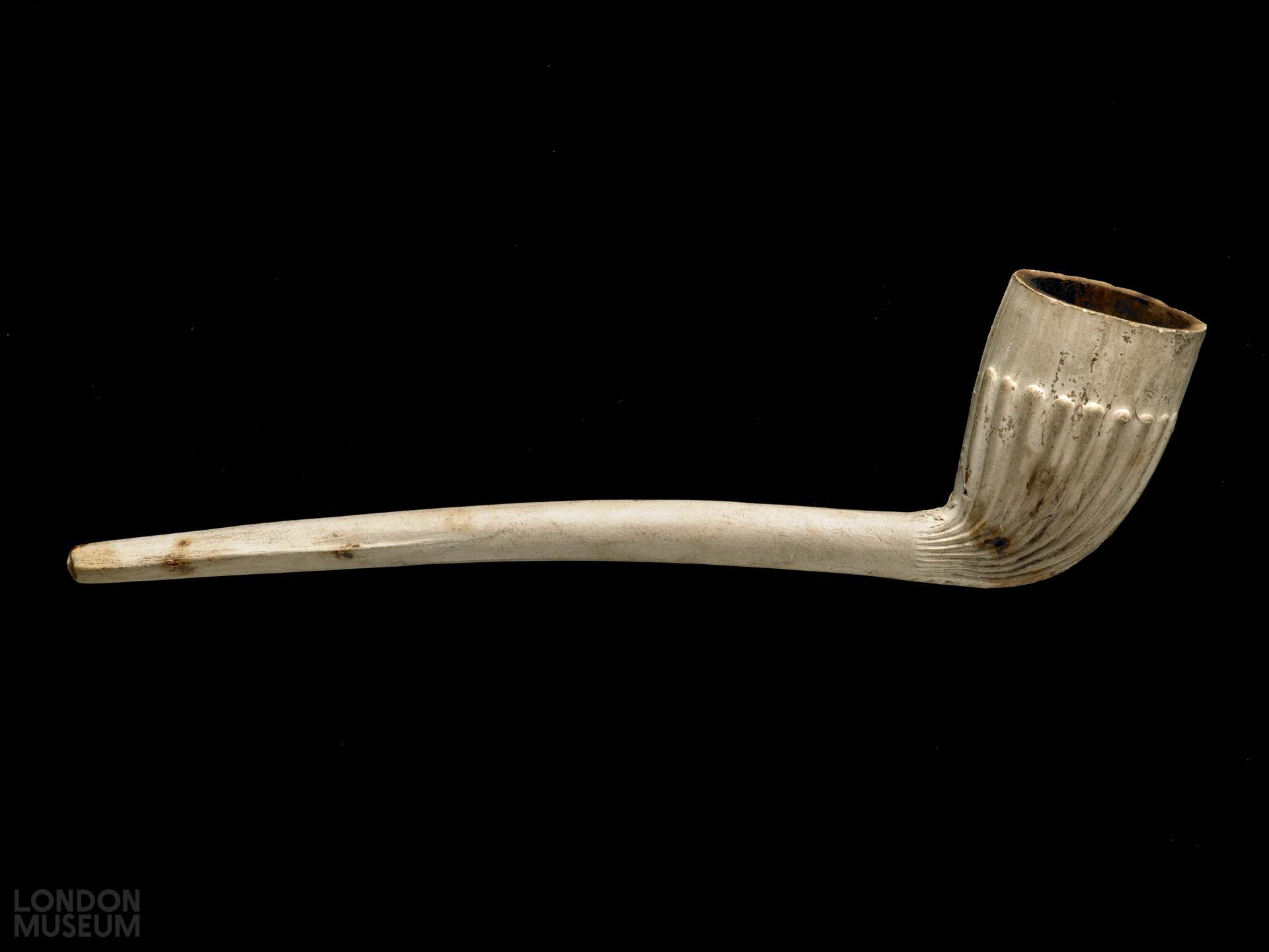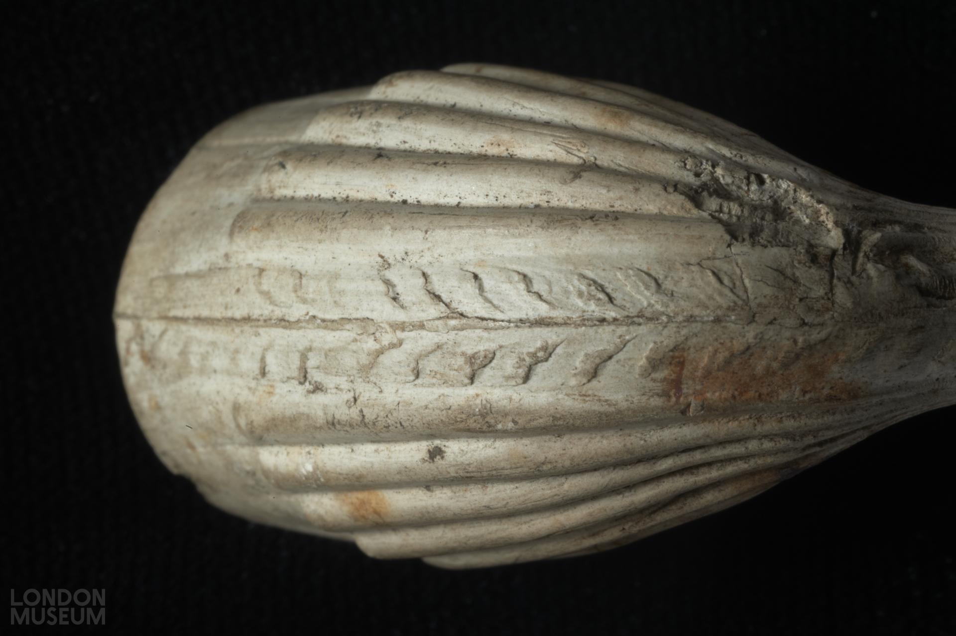 Complete bowl. Moulded decoration: gadrooning on lower two-thirds of bowl., and leaves along bowl-seam, on front only. Atkinson and Oswald (1969) type 30