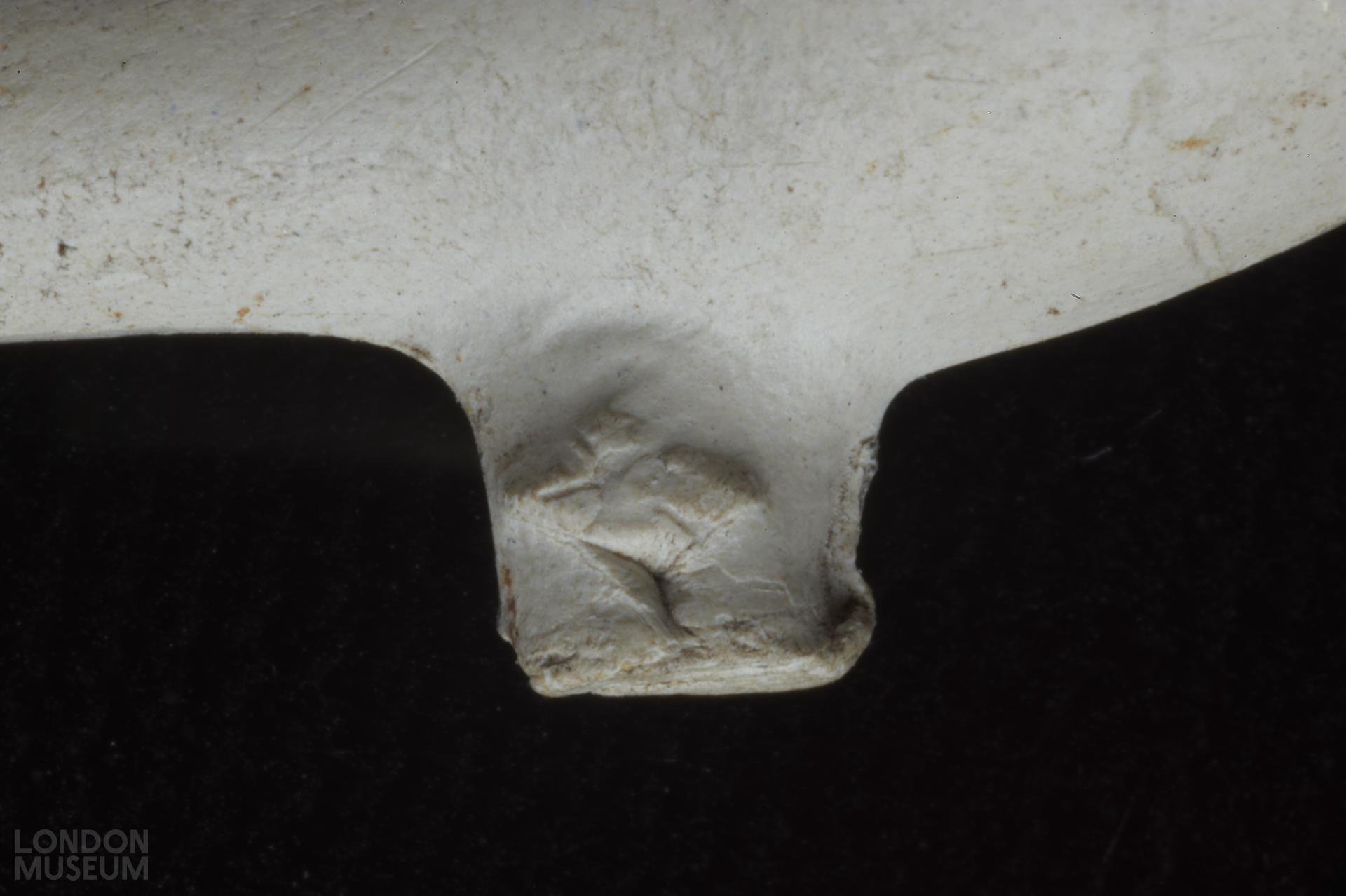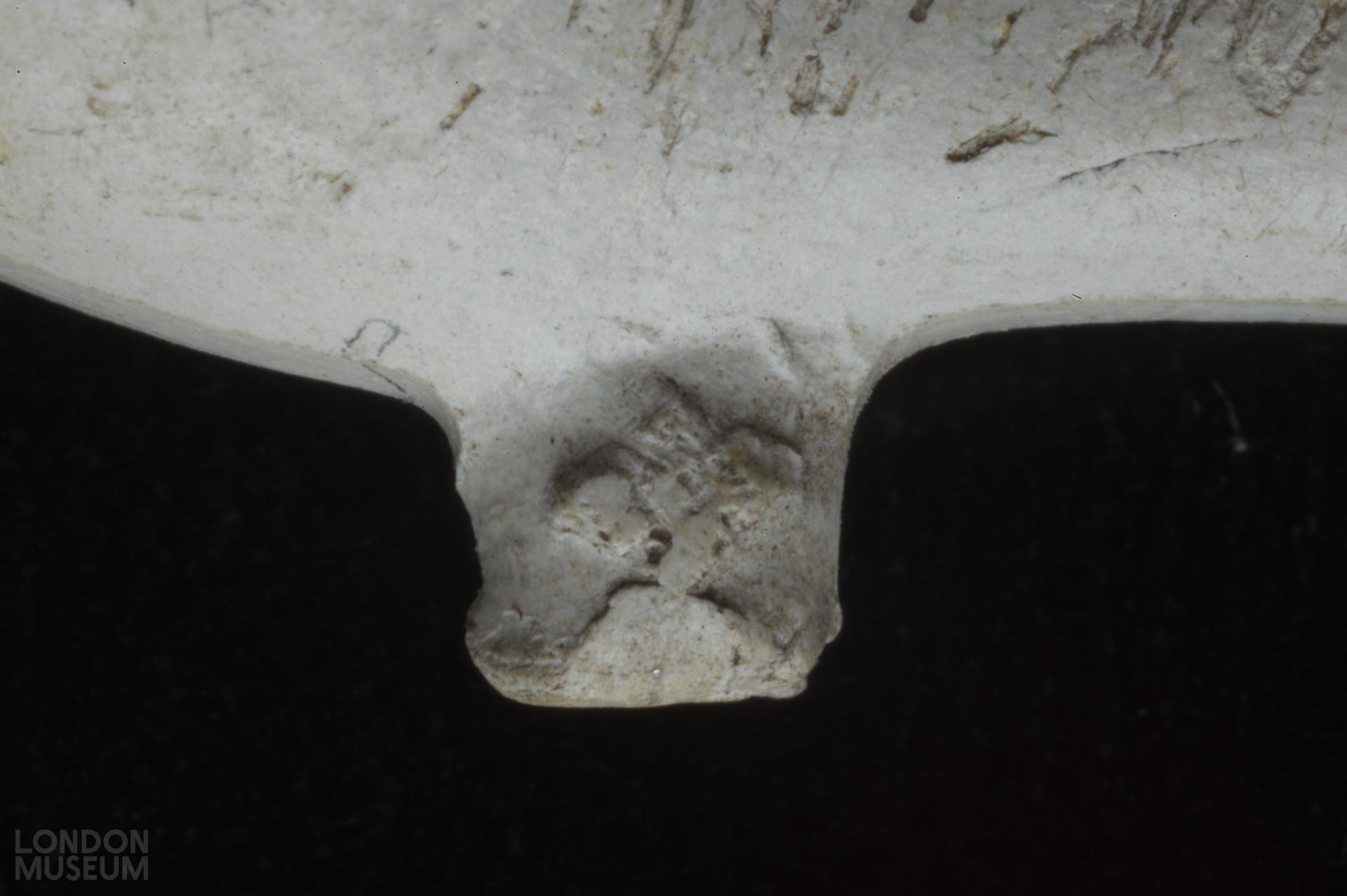 Complete bowl. Moulded marks on sides of heel, in relief: a flower (left side facing smoker) a flower (right side). Atkinson and Oswald (1969) type 27