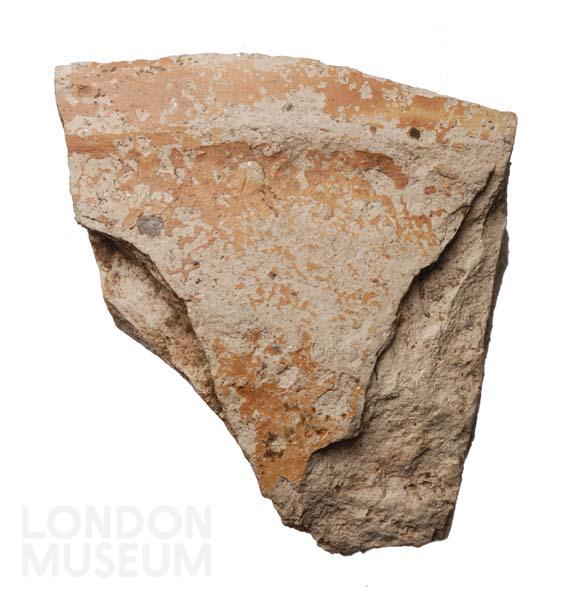 Incomplete ceramic closed lamp, body fragment. Only part of the curved wall survives. ?Central Gaulish colour-coated ware (white fabric) (CGWH).