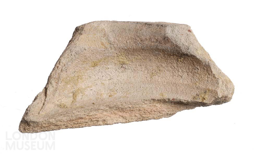 Incomplete probable type 11 ceramic open lamp, body fragment. Body with flat rim and wall angled slightly outwards. Trace of an applied handle. Verulamium/London region white ware (VRW).