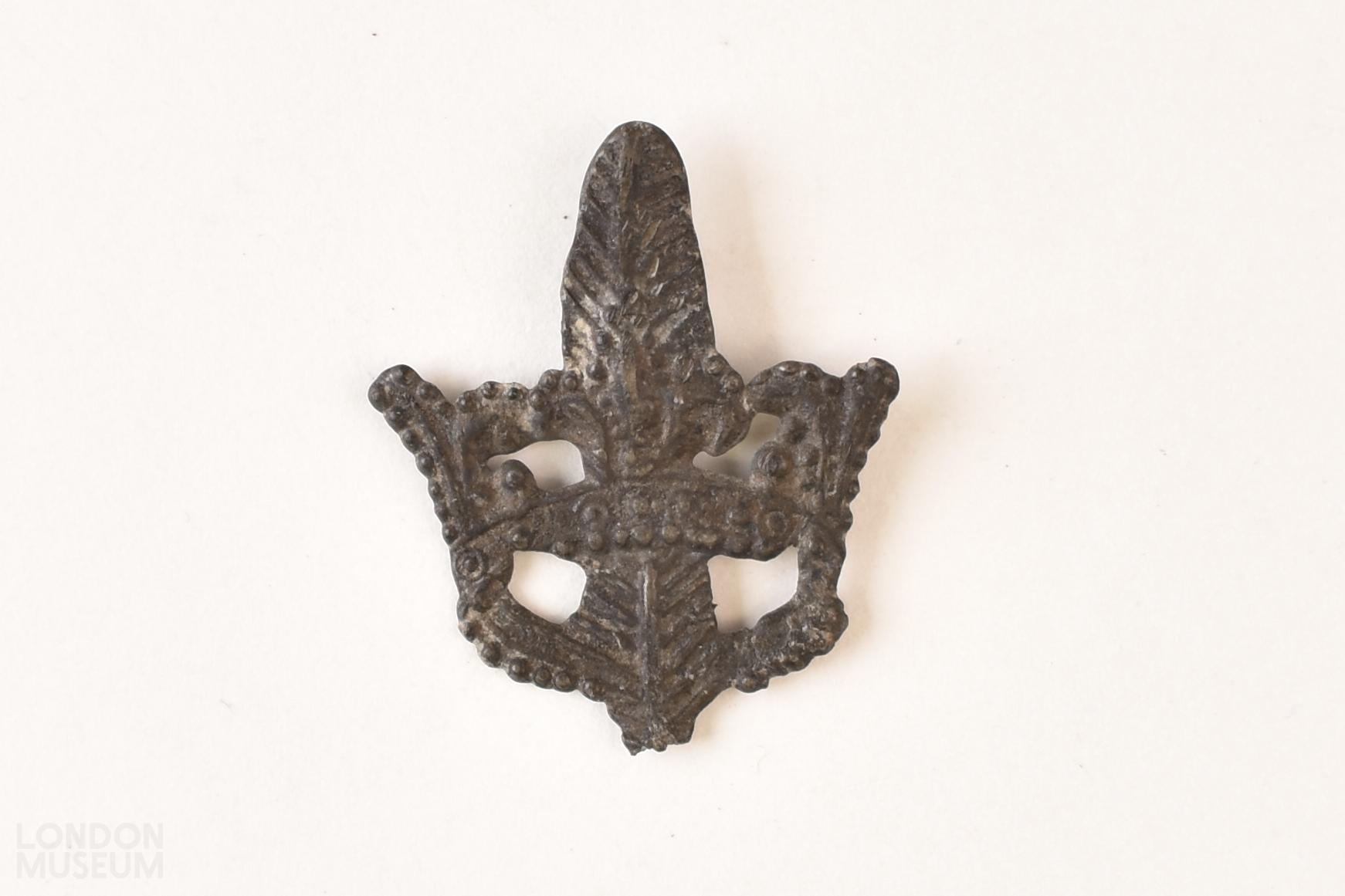 Livery badge in the form of an ostrich feather - a symbol of the House of Lancaster, dated to the 15th century. This is the most common form of feather badge found in London and seems to have been a generic Lancastrian badge.
