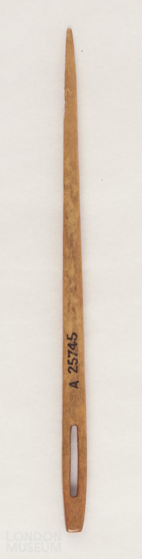 Bone needle with oblong eye and rectangular shaft, sharpens to a point at one end.