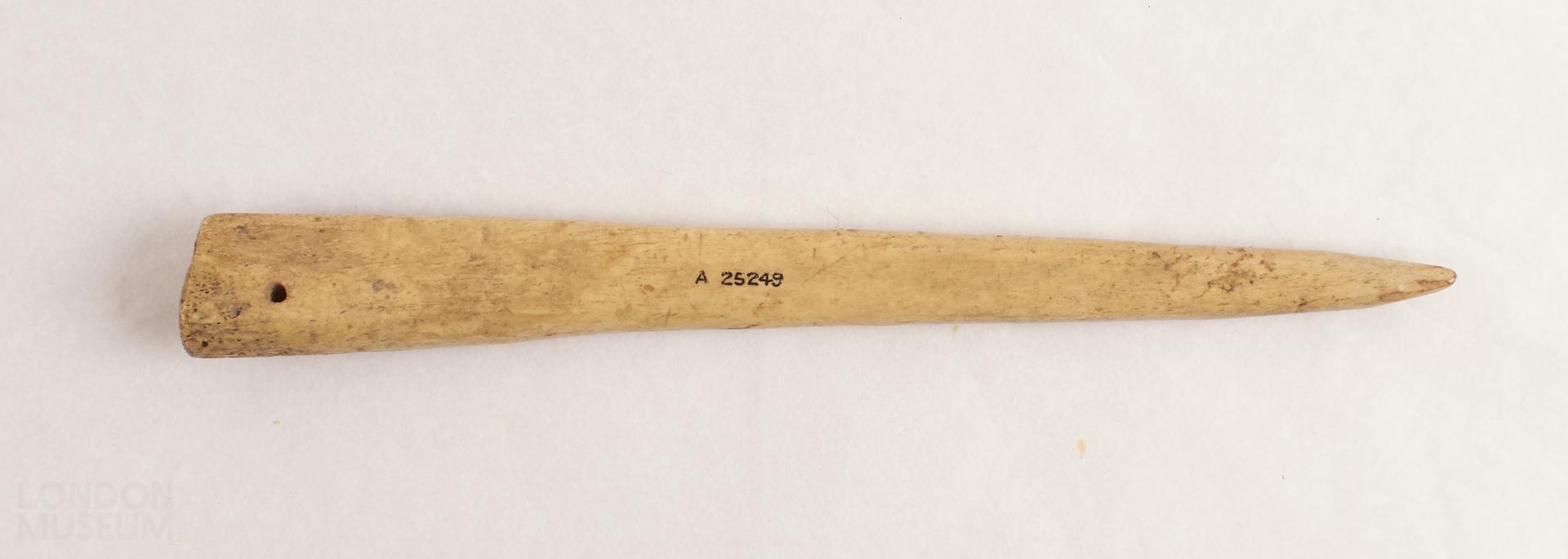 Point made of bone, possibly awl, dagger or end of skating pole. Leg-bone sharpened to a point, with a small perforation at the blunt end. No decoration, with a round section