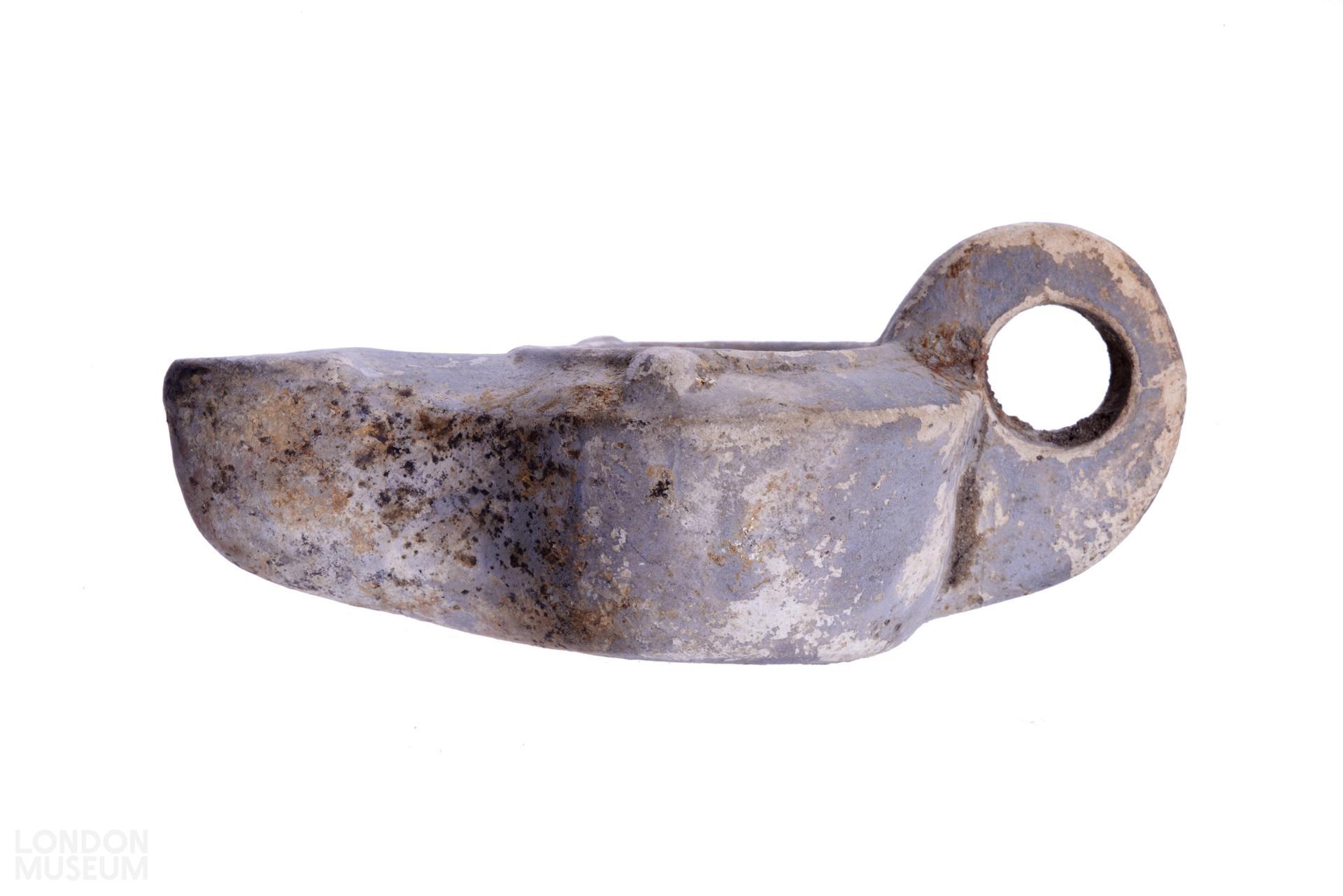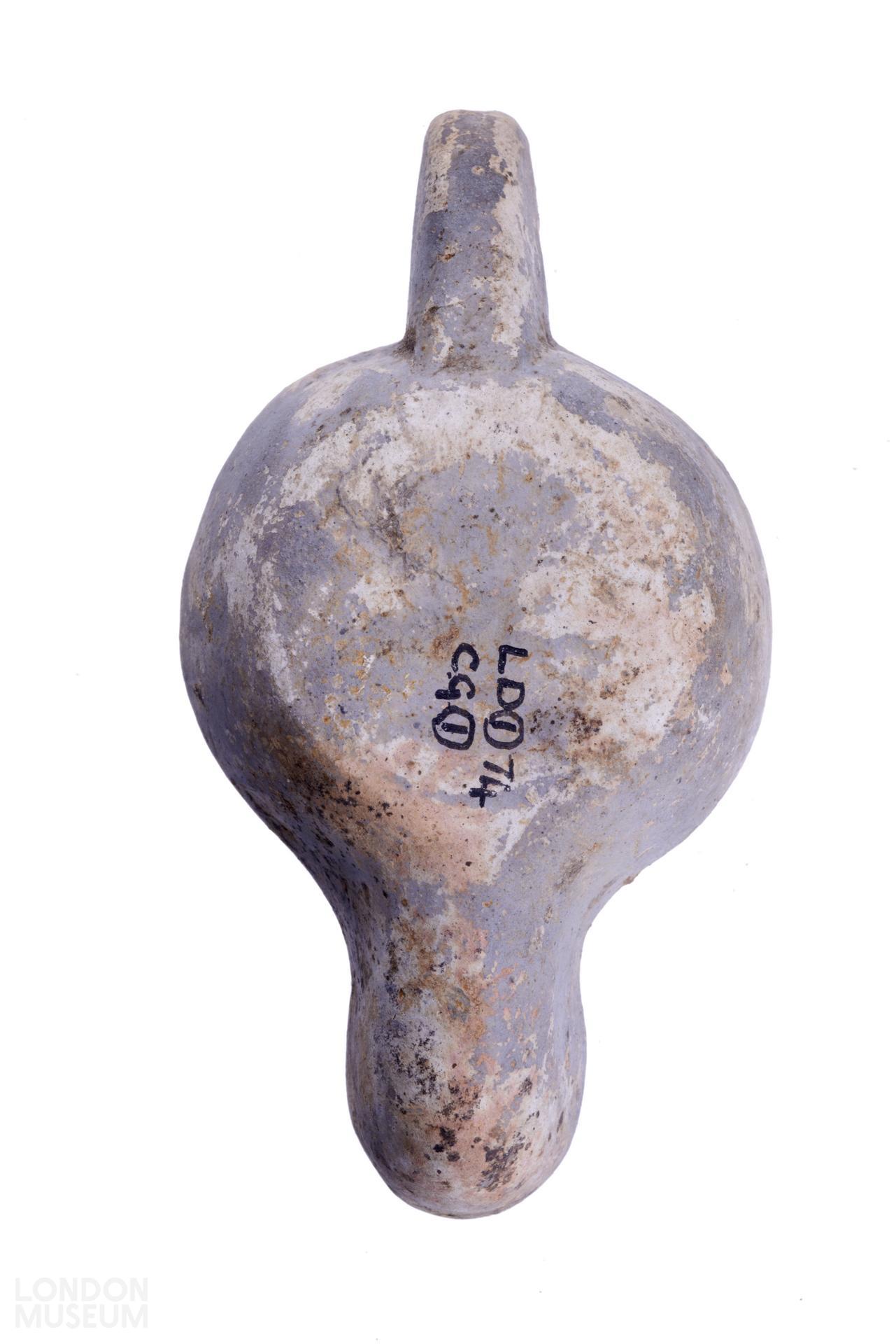 Complete type 9 A/B variant ceramic factory lamp. Rounded nozzle with flat D-shaped tip and closed nozzle channel; circular wick hole. Externally bevelled shoulder with raised internal rim and two solid lugs; flat discus with one centrally positioned oil-filling hole; circular base with concentric grooves; very worn maker's mark, [...]O[...]. Complete, undecorated mould-made handle. Central Gaulish colour-coated ware (other fabric) (CGOF).