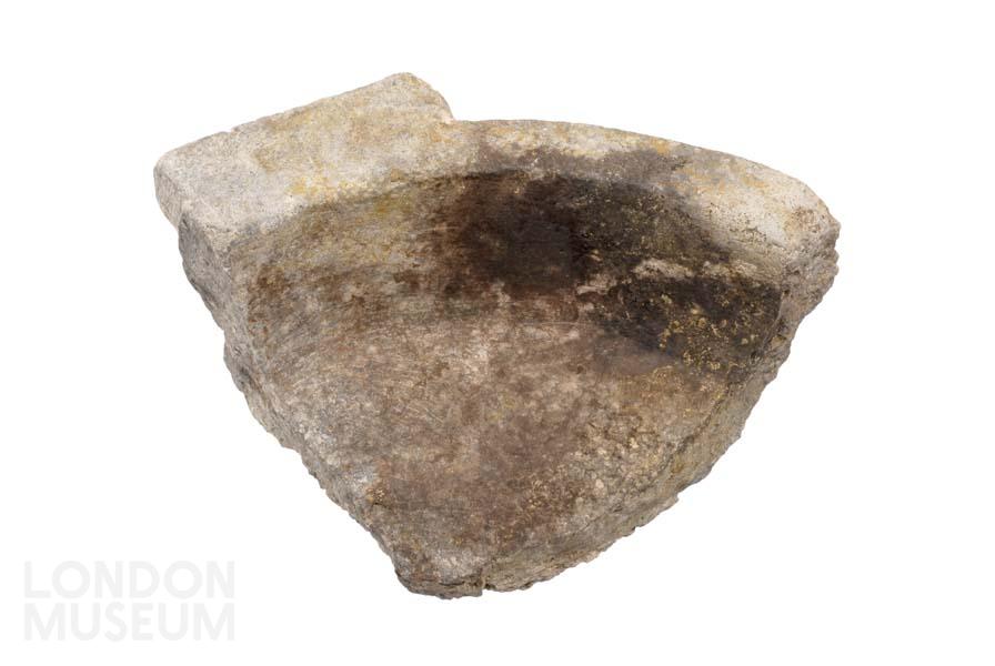 Purbeck marble. Fragment with rim, base and part of a rectangular lug, the edges squared. . The outside surface is pecked; the upper edge of the rim is ground
