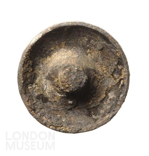 Copper-alloy lock pin. Circular iron shaft (broken); bell-shaped stud with raised circular mouldings and central pommel.
