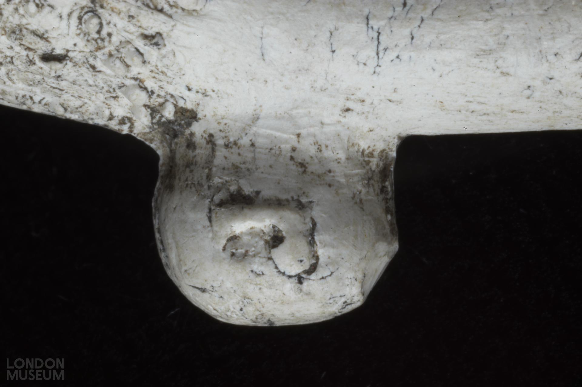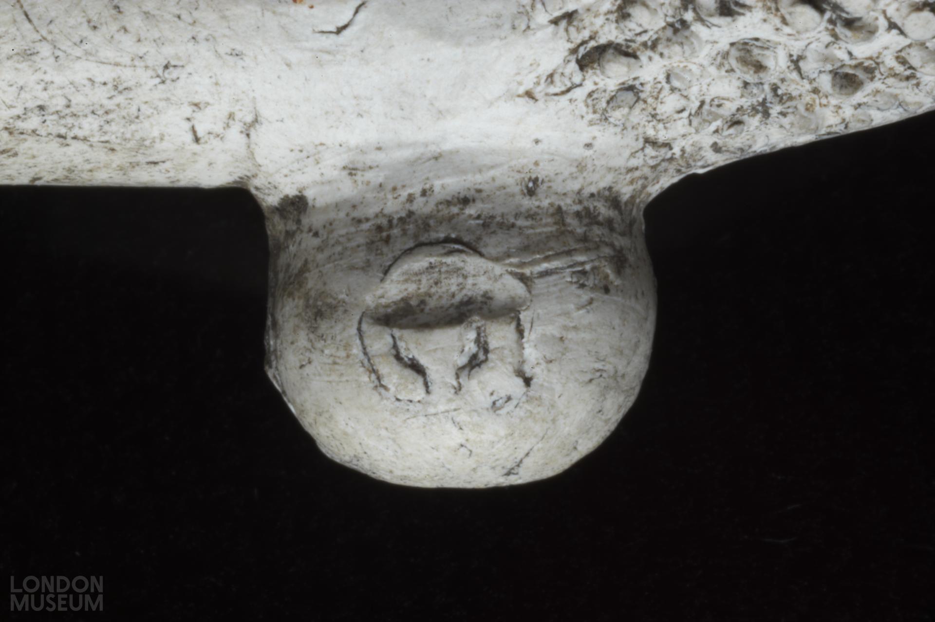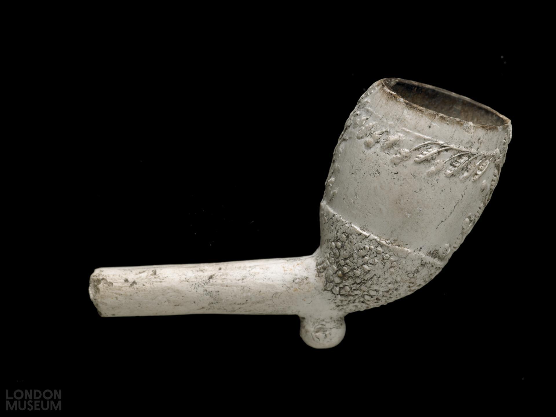 Complete bowl. Moulded decoration: oak leaf and acorn seams, and acorn design. Moulded marks on sides of heel, in relief: J (left side facing smoker) C (right side). Atkinson and Oswald (1969) type 29A