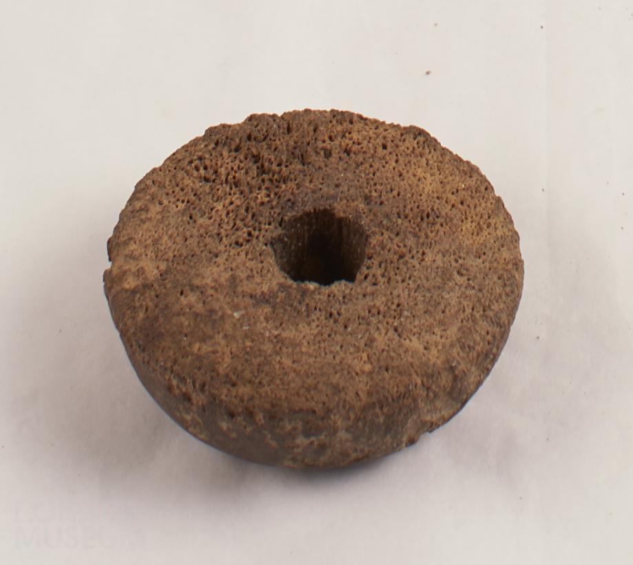 Spindle whorl, circular shape with flat base and hole running through the centre; 1 incised line around perimeter; spongy bone visible on the base. Rough in texture.