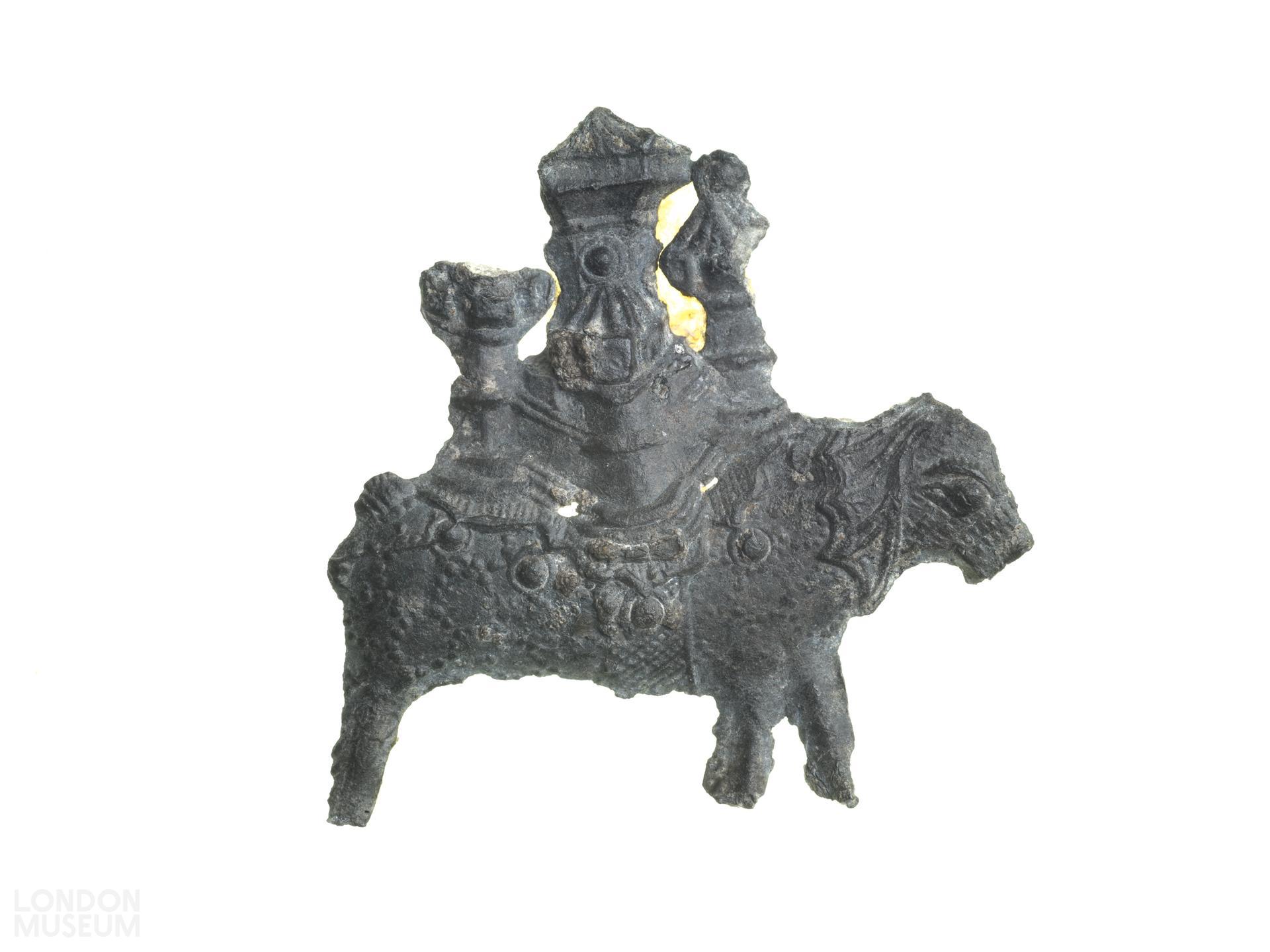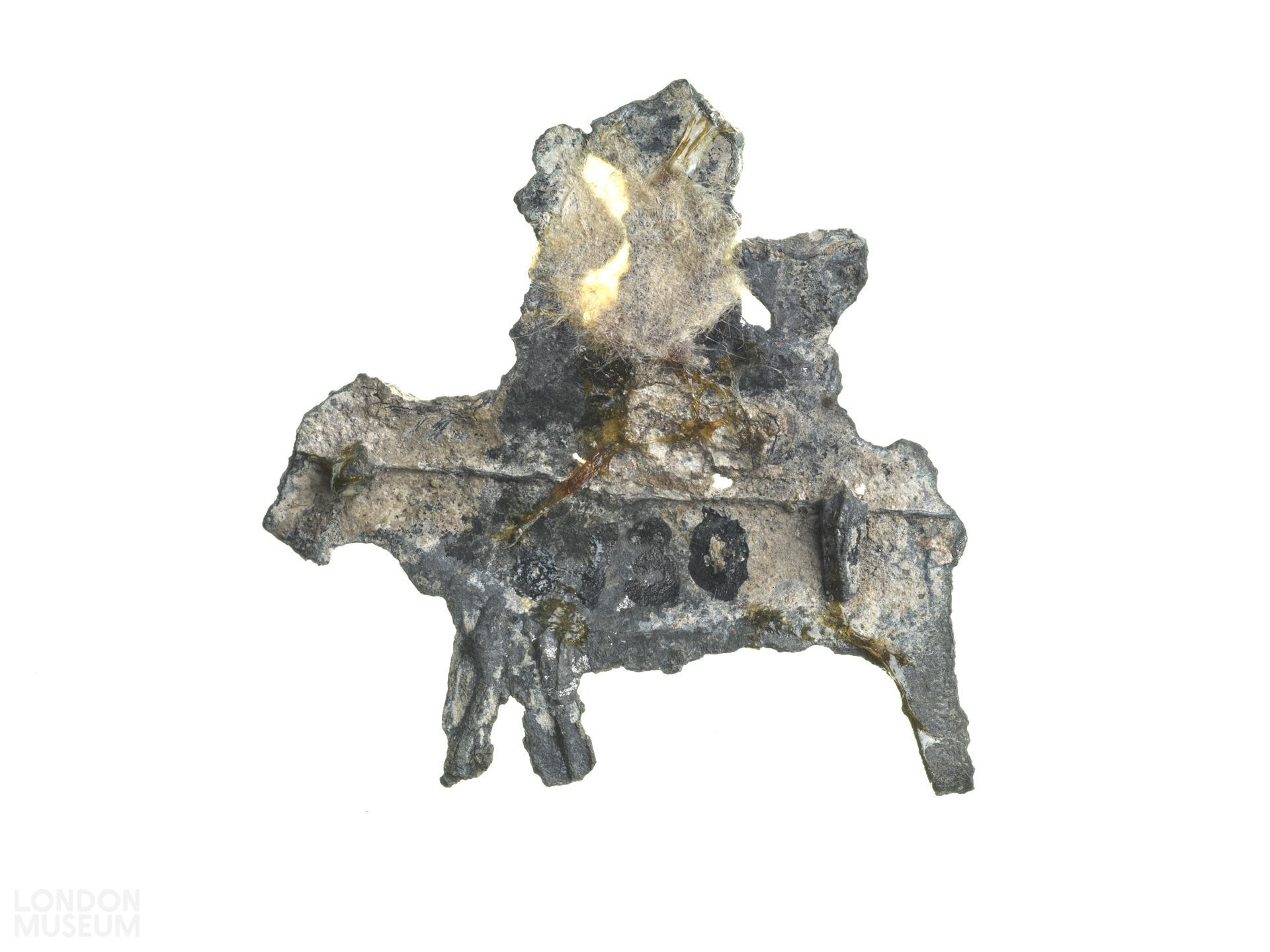 Livery badge in the form of an elephant and castle, dated to the 15th century. The medieval bestiary said that Indian and Persian warriors fought from wooden towers on the backs of elephants. The elephant and castle was a badge of William, Viscount Beaumont (1438-1507). He was an active supporter of Henry VI and was on the losing side at the battles of Towton (1461) and Barnet (1471) and spent the remaining years of Yorkist rule in exile or prison. There are other badges from similar moulds in Salisbury Museum (190t/1987) and the British Museum (1856,0701.2152).