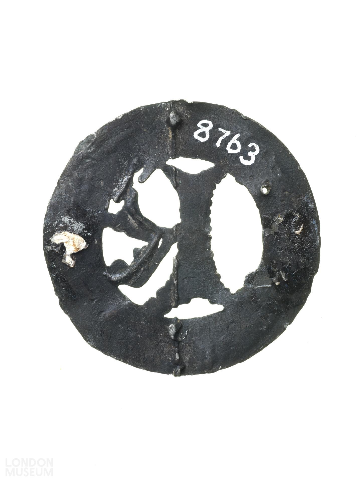 Lead alloy secular badge in the form of a letter "K" within a circular frame decorated with dots within circles.