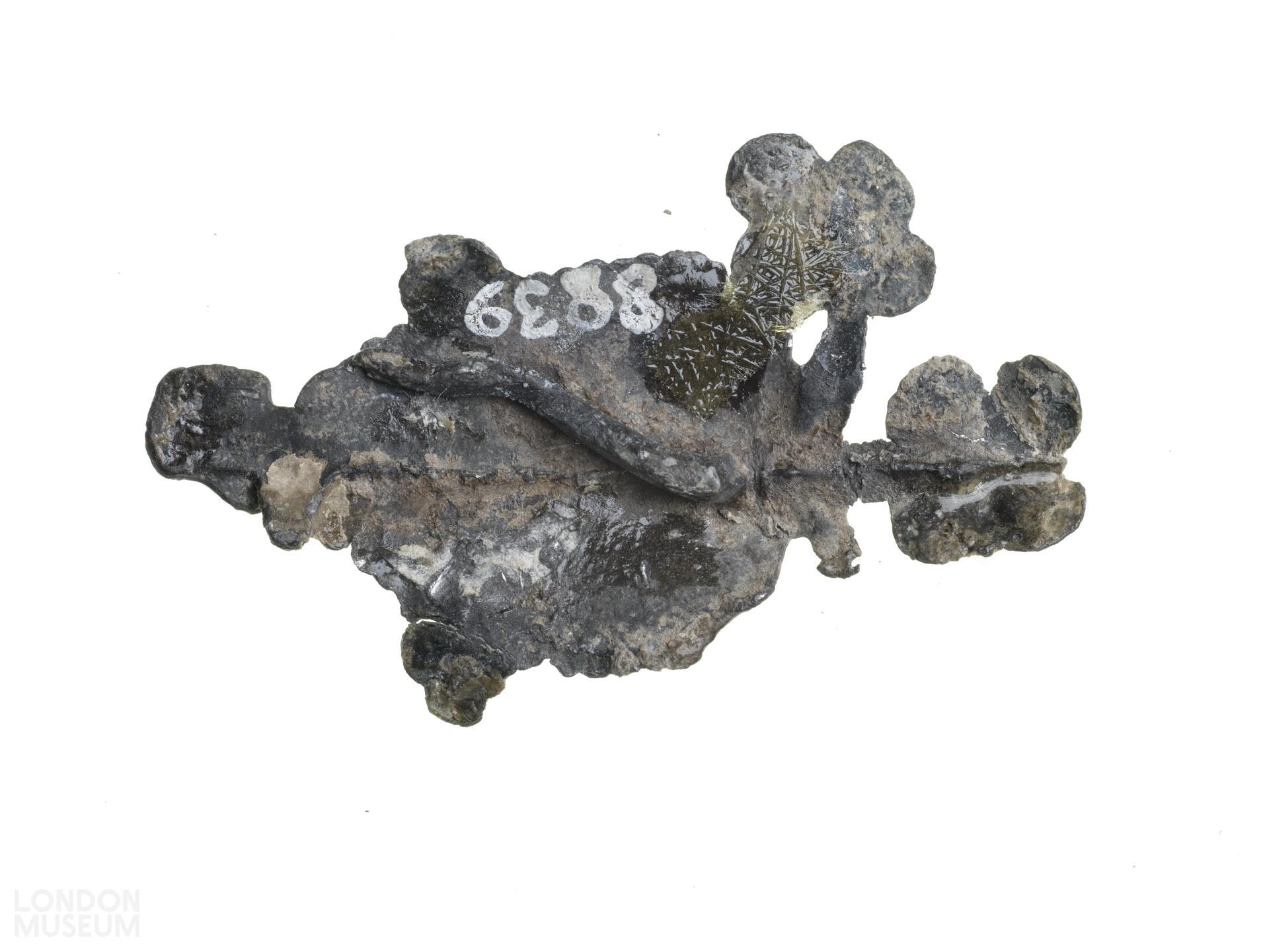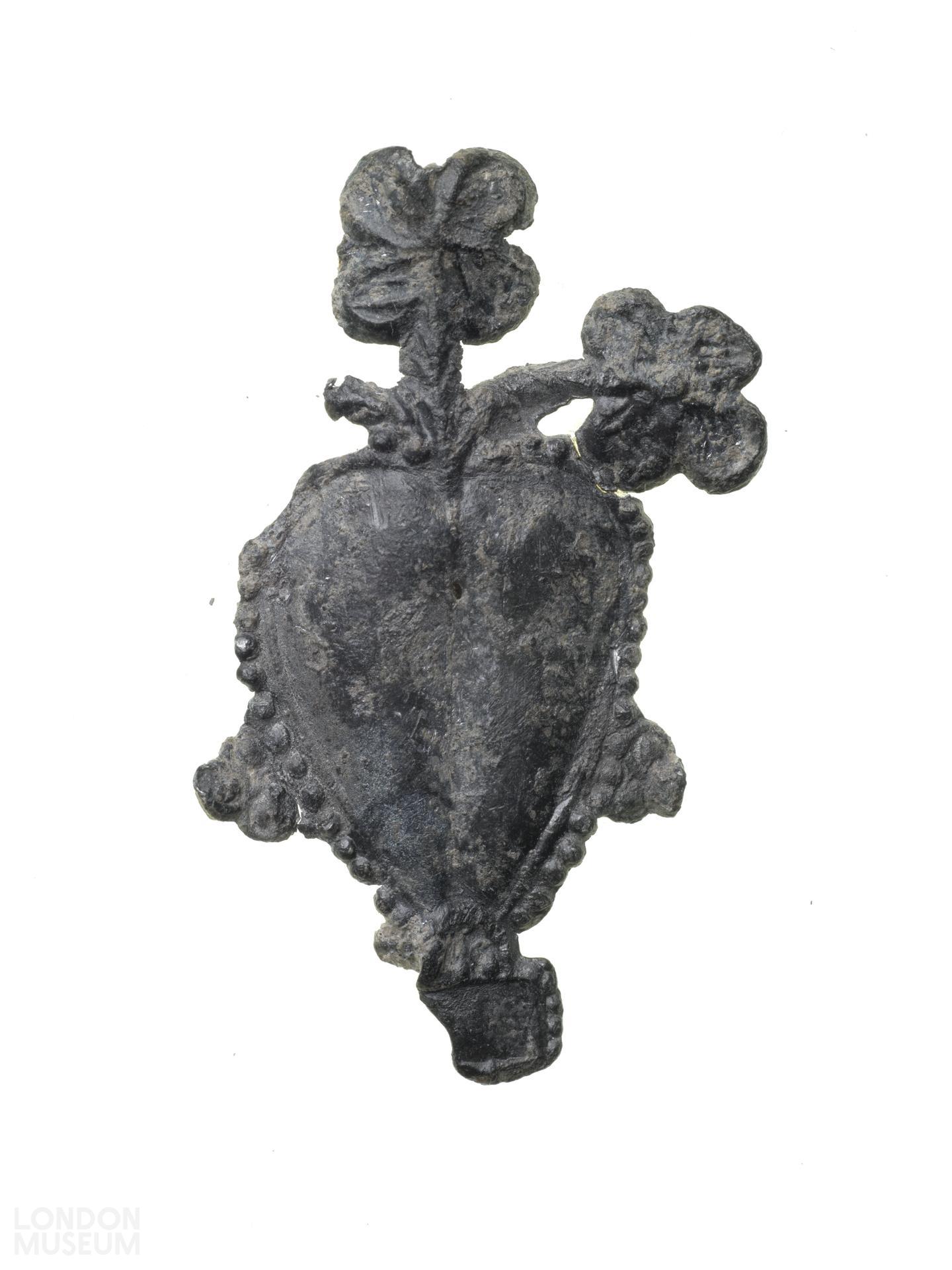 Secular badge in the shape of a heart with two quatrefoils, or flowers, sprouting on top (a third now missing). The heart has a pearled border. The badge was possibly a lover's token, as flowering hearts were common symbols on betrothal and wedding rings of the period.