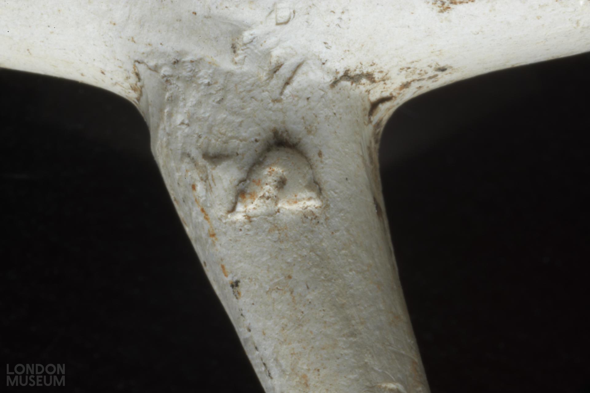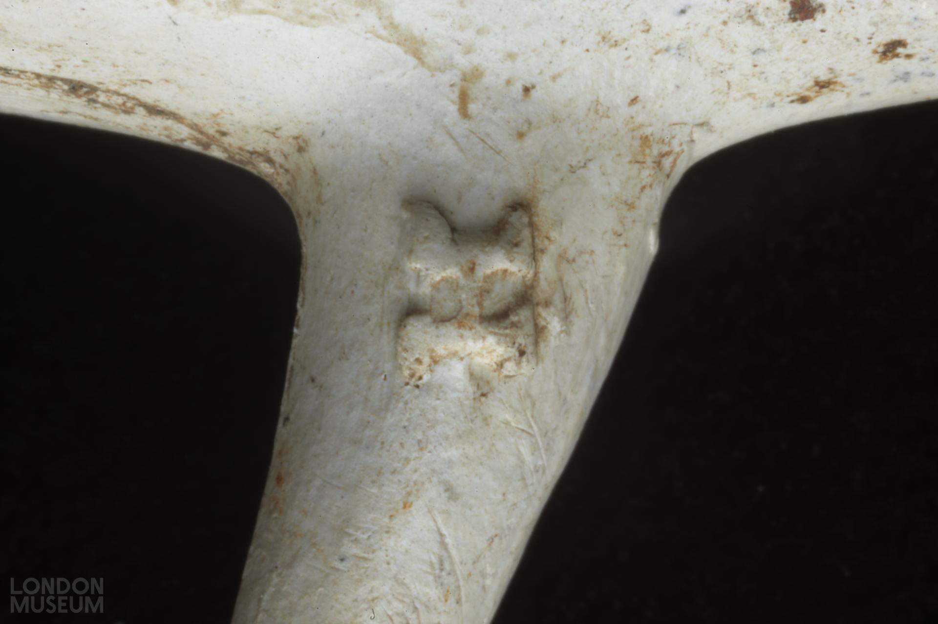 Bowl, incomplete. Moulded marks on sides of spur, in relief: H (left side facing smoker) S (right side). Atkinson and Oswald (1969) type 26