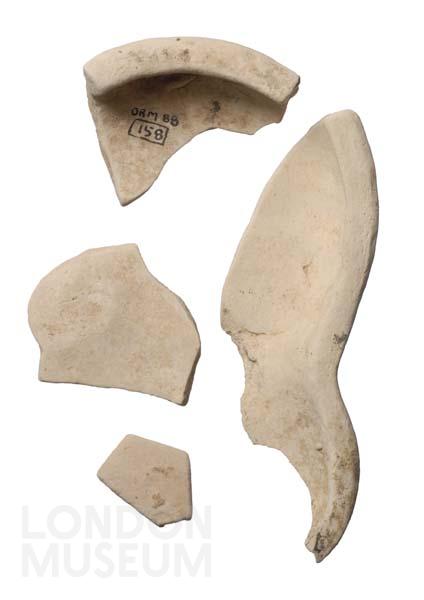 Incomplete type 11A ceramic open lamp, body fragments, three joining pieces and one non-joining piece. Body has a flat rim with wall curving slightly outwards; flat circular base. Colchester early colour-coated ware (COLEC).