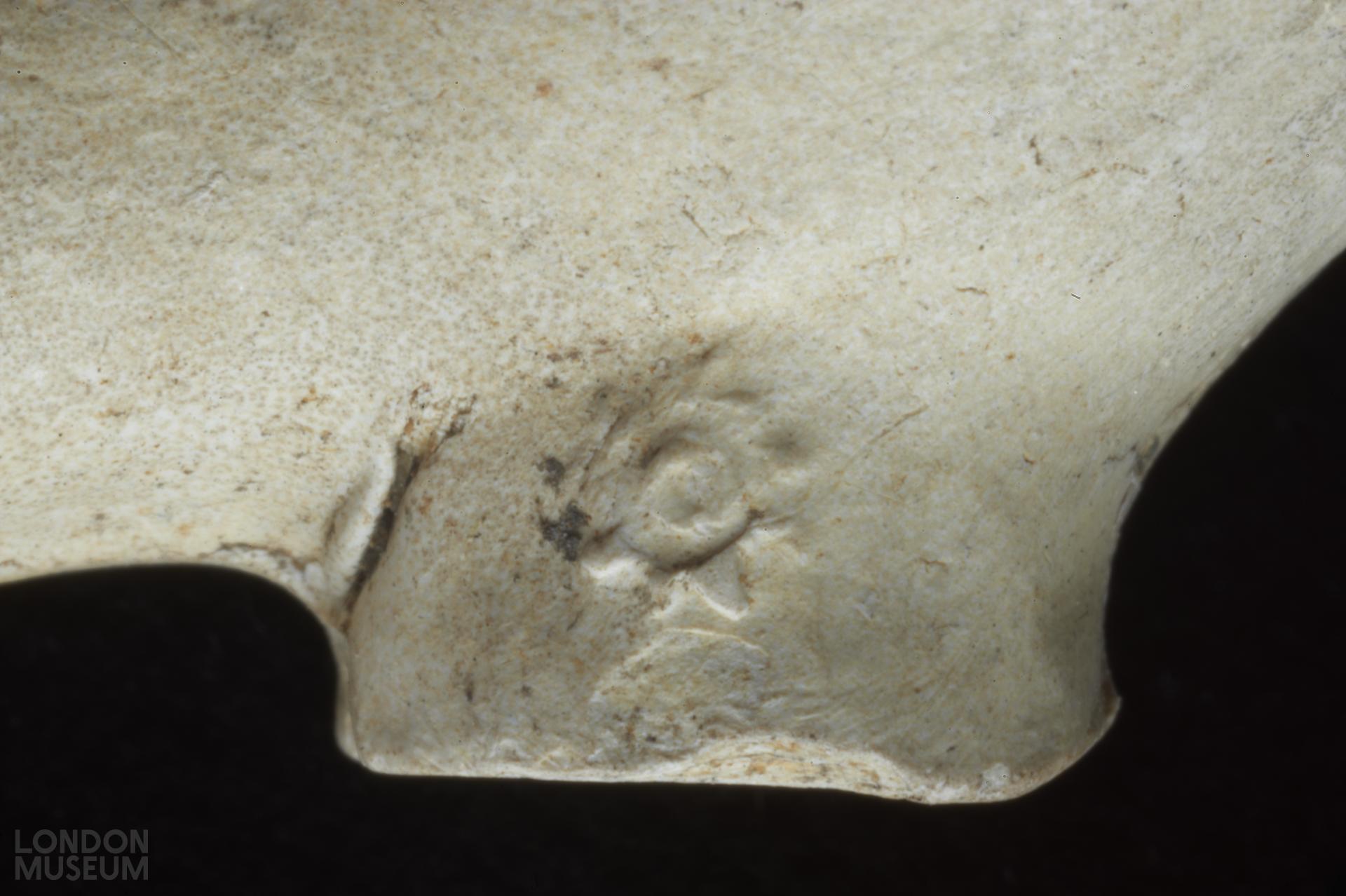 Complete bowl. Moulded marks on sides of heel, in relief: a rowel (left side facing smoker) a rowel (right side). Oswald (1975) type 12