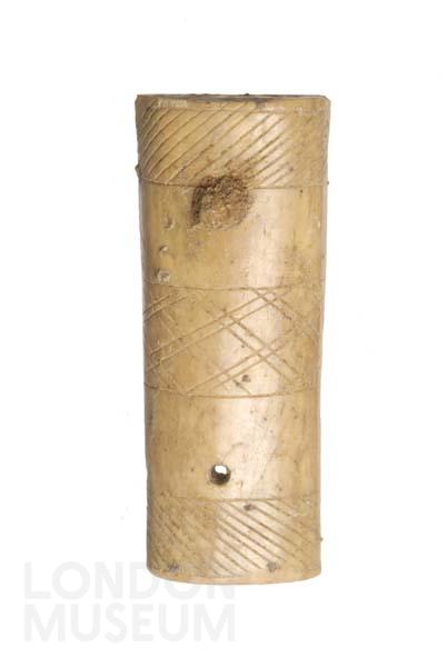One plate from a two-piece bone handle, which was secured to an iron plate tang with two rivets. The plate is D-shaped in section, tapering slightly and is damaged on one side; outer face decorated with bands of symmetrical incised decoration, a zone of double lattice in the centre with bands of slanting lines at the ends.