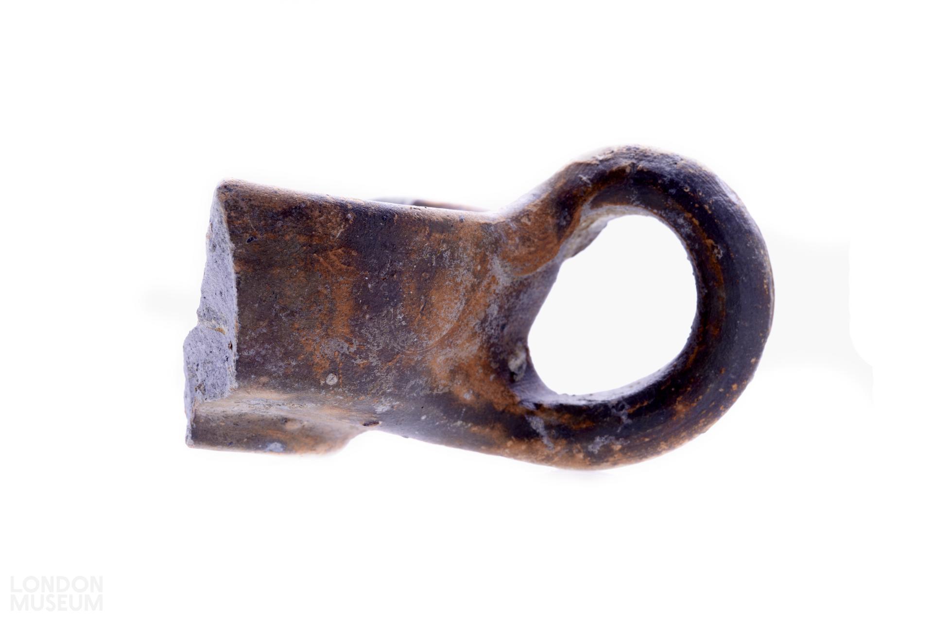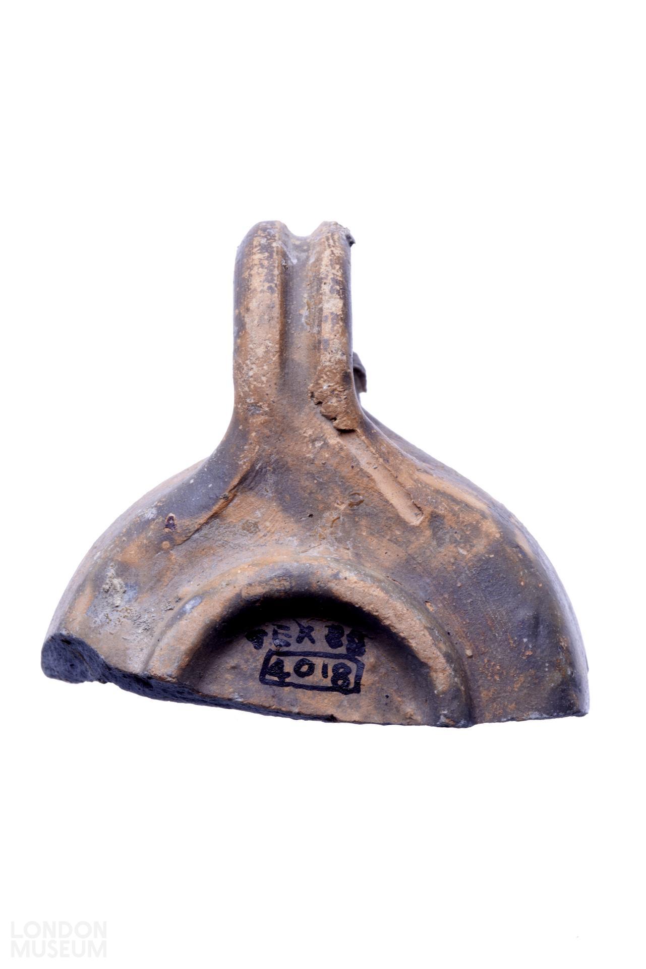 Incomplete type 11B ceramic open lamp, missing the nozzle. Body with rounded rim, the wall angled slightly outwards; flat base with circular foot ring. Applied handle decorated with one wide groove. ?East Gaulish lamp fabric (EGAUL).