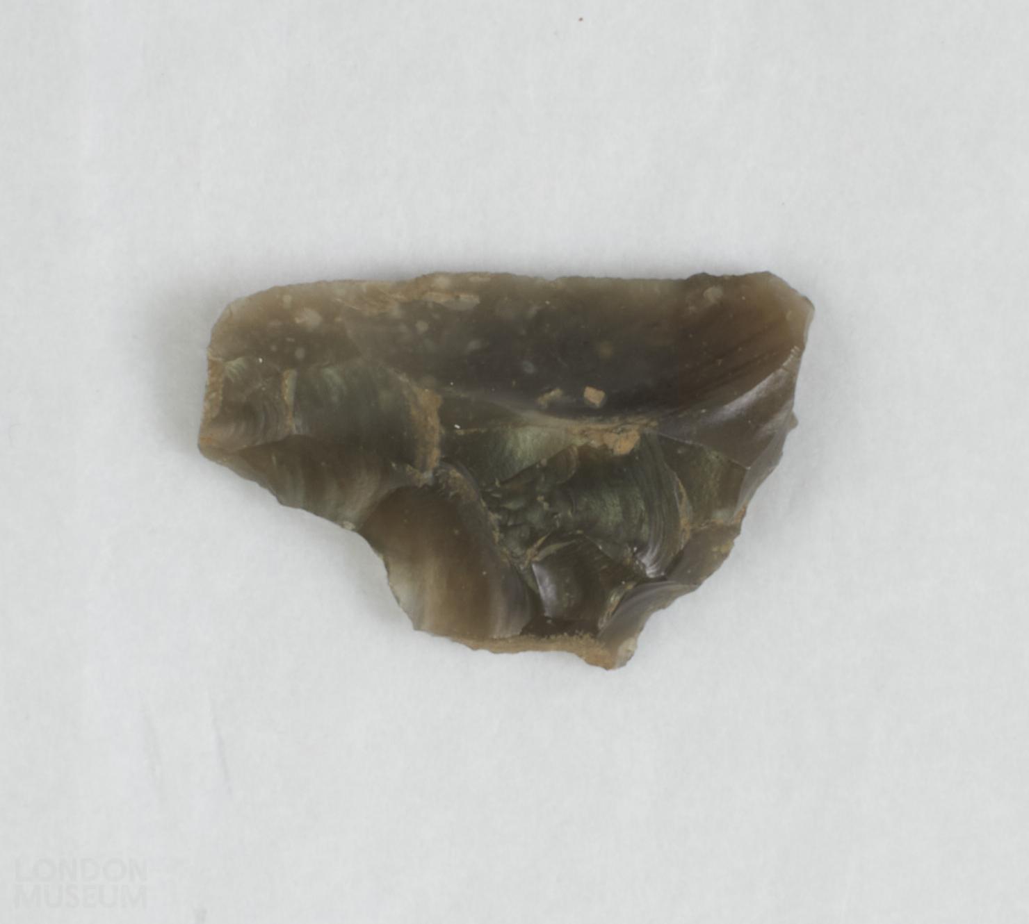 Flint flake of irregular shape, brown in colour with worked surface. Retouch along the shorter edge.