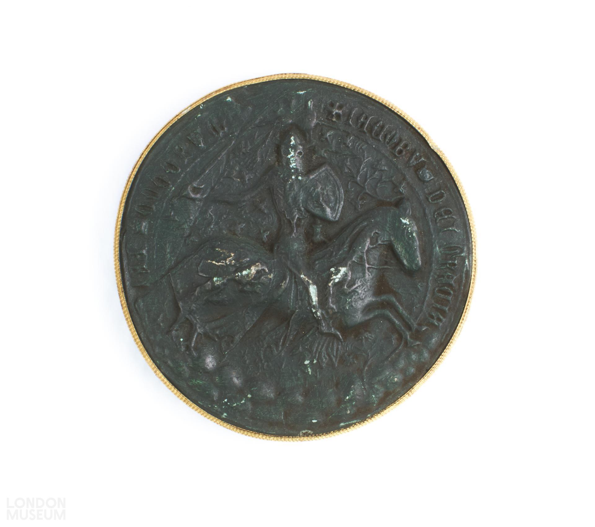 Seal impression in dark green plaster, with a gold coloured border, and a blue edge of the second seal of James V of Scotland. The image depicts a man (James V), riding a horse, while holding a sword on the right hand and a shield on the left hand. The text around the image reads 'IACOVS DEI GRACIA [...]'. 'James V 1513-42' and the number '47' are etched on the reverse.