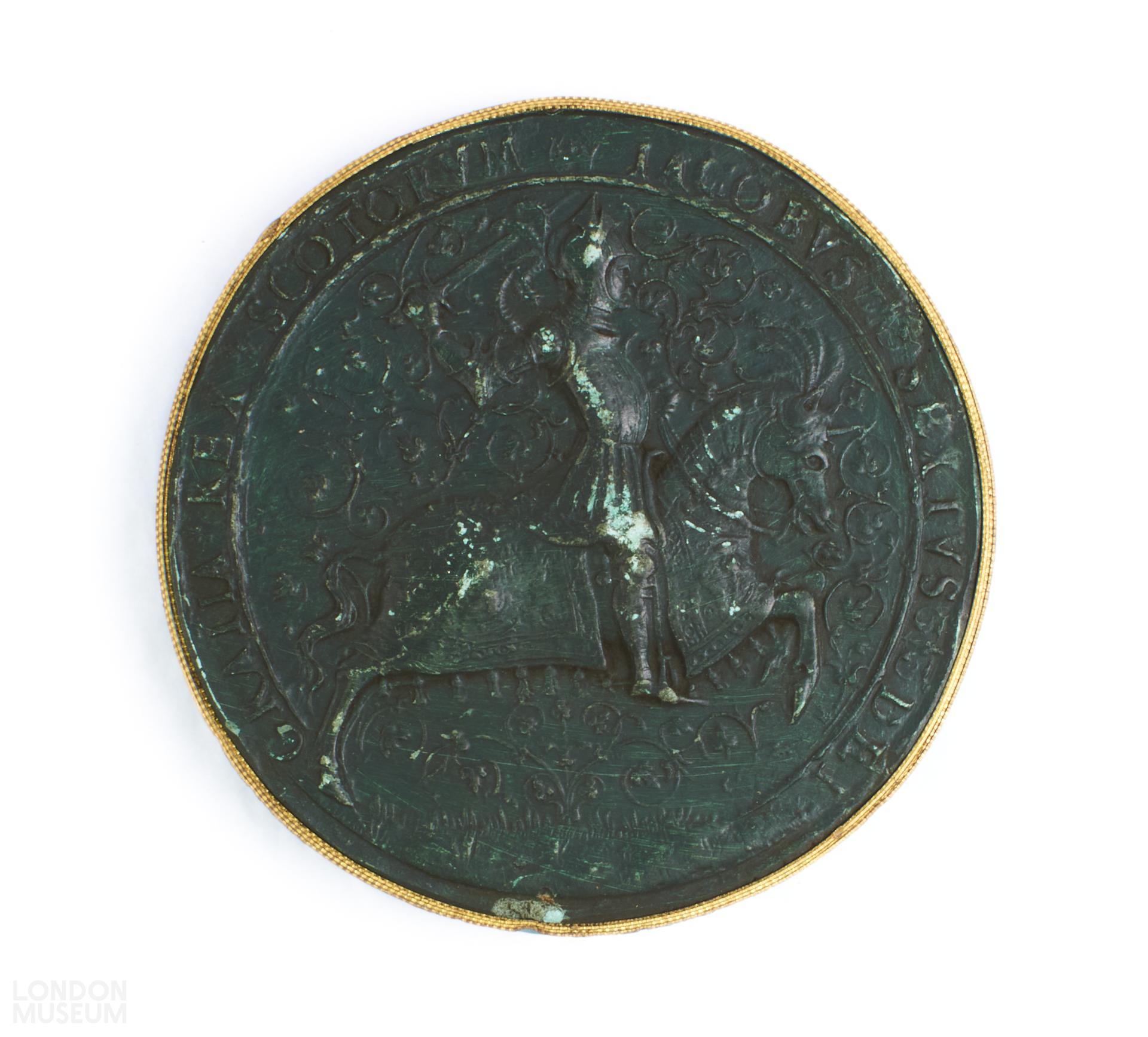Seal impression in dark green plaster, with a gold coloured border, and a blue edge of the seal of James VI of Scotland. The image depicts a man (James VI), riding a horse, while holding a sword on the right hand and a sword on the left hand. The text around the image reads 'IACOBVS SEXIVS DEI GRATIA REX SCOTORVM'. 'Robert I 1320' and the number '25' are etched on the reverse.