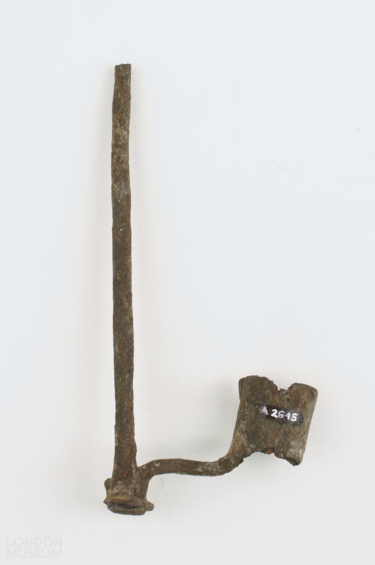 Iron candle holder, comprised of a rod with two feet at the bottom and a branch with socket at right-angles to this, socket is broken.
