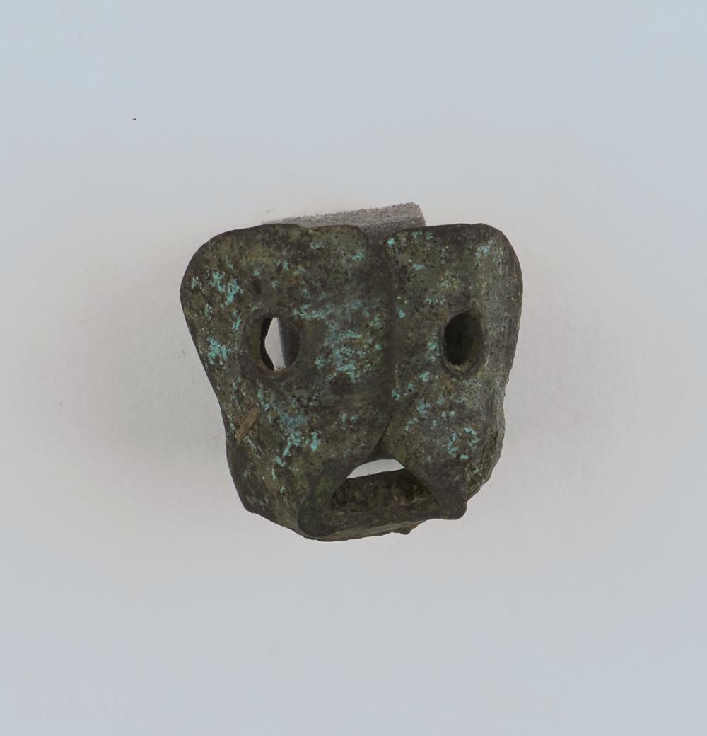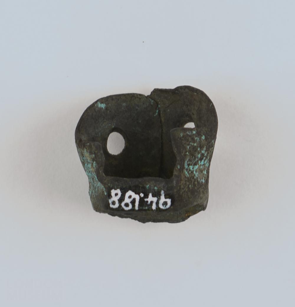 Copper alloy mount, with green discolouration, possibly verdigris, and with two circular holes in the side.