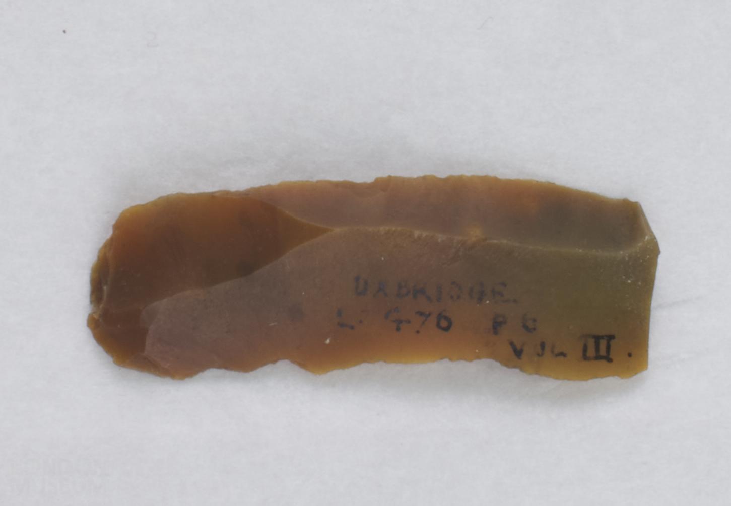 Flake made of dark brown flint, rectangular shape with steep retouch on both sides and some on the base. Possibly a blade.
