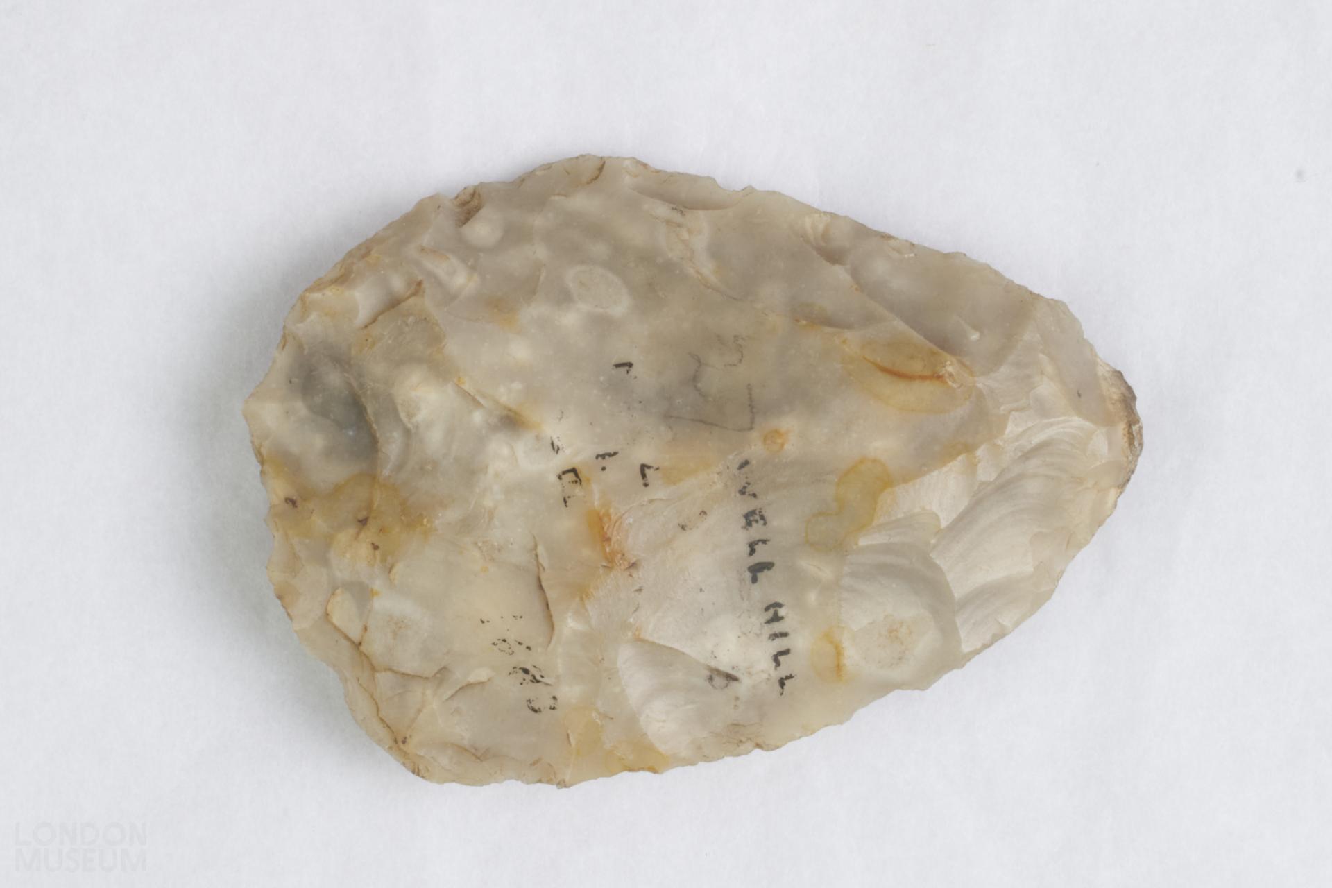 Projectile head of grey flint, formed by bifacial retouch. The thinnest end has no retouch. Probably hafted at this thin end. Perhaps used as a spearhead or arrowhead. Remnants of label and adhesive.