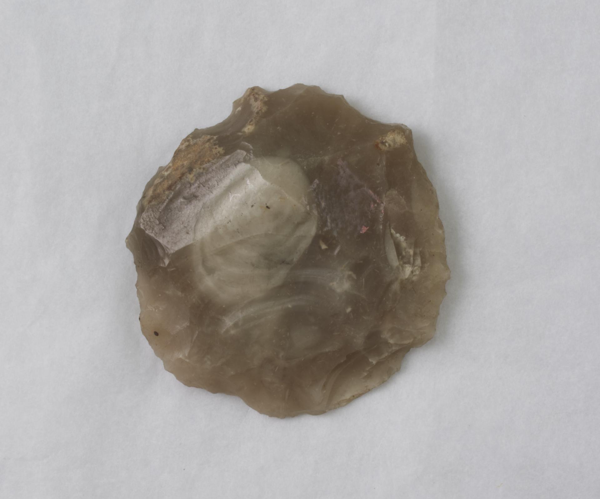 Disc scraper of grey flint. Neolithic. Roughly circular in shape. Nearly whole edge has been retouched.