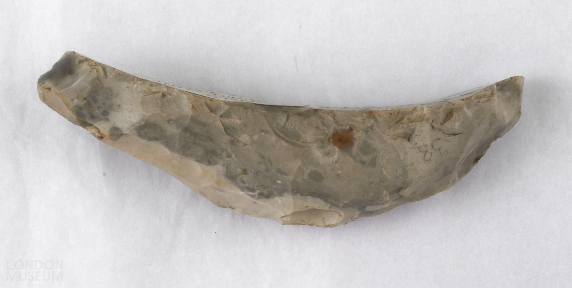 Crescentic fabricator of grey flint. Steep sides culminating in a ridge, triangular in section. Tapered at both ends.