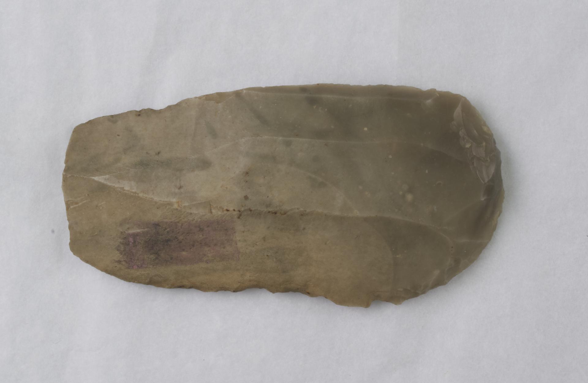 Long end-scraper of grey flint. Curved profile, roughly rectangular in shape. Retouched at one end, and partly down one side. Neolithic.