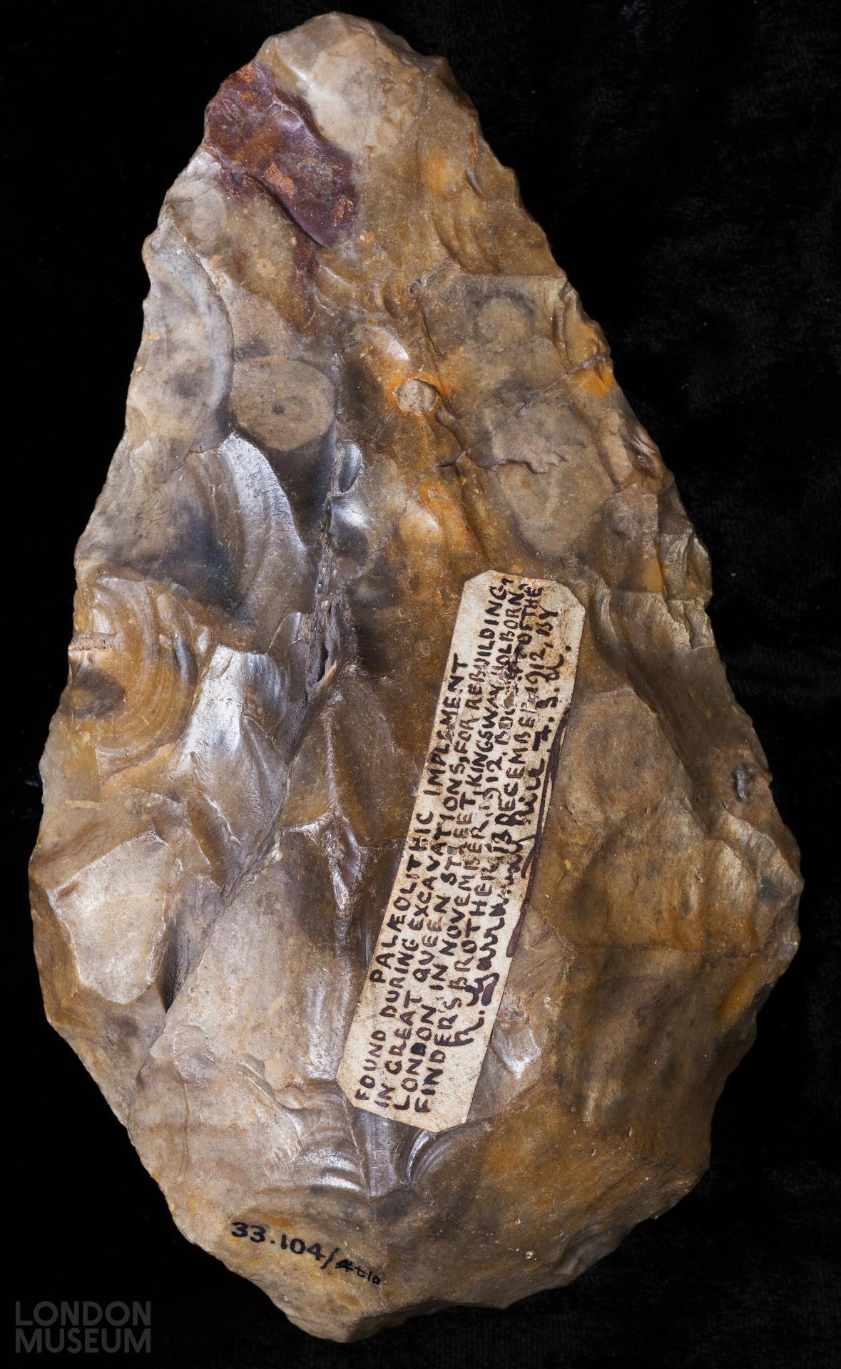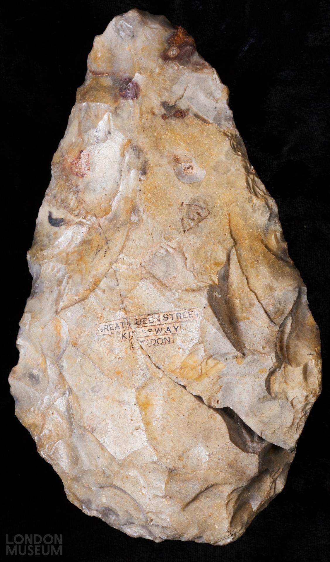 Label reads: 'Palaeolithic implement/ found during excavations, for rebuilding, in Great Queen Street, Kingsway, Holborn, London, in November, 1912,?, to the finder's brother 13 December 1912, by ?' and 'Great Queen Street/ Kingsway/ London'.