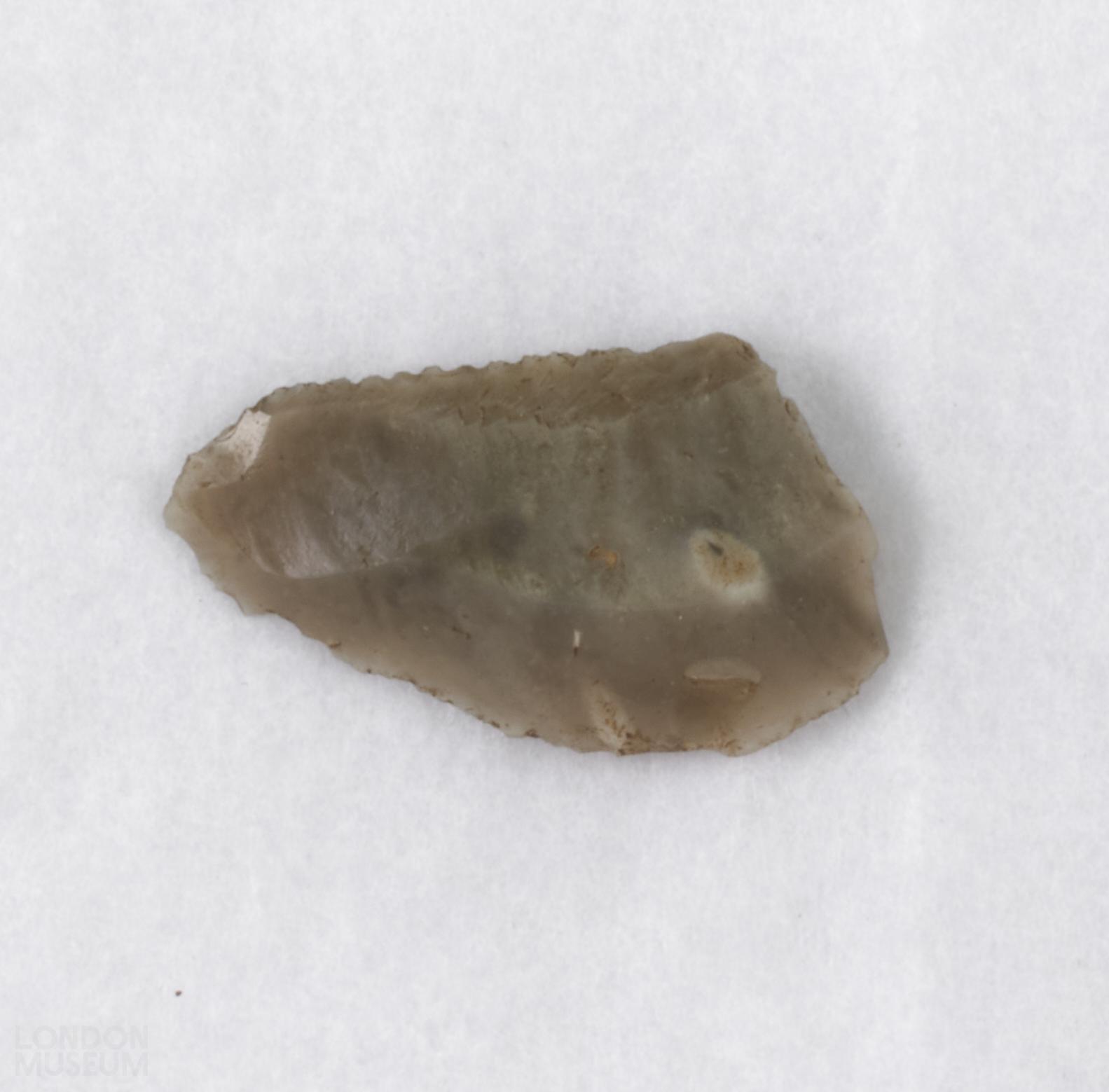 Incomplete flint saw with bulbar end broken. Neat serrations along one edge. Slightly curved.
