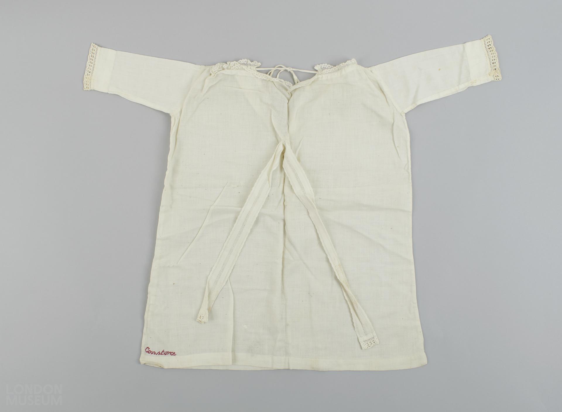 Doll's white cotton nightdress trimmed with lace at neck and cuffs. Tie belt attached at the front and drawstring neck. 'Constance' embroidered in red on garment.