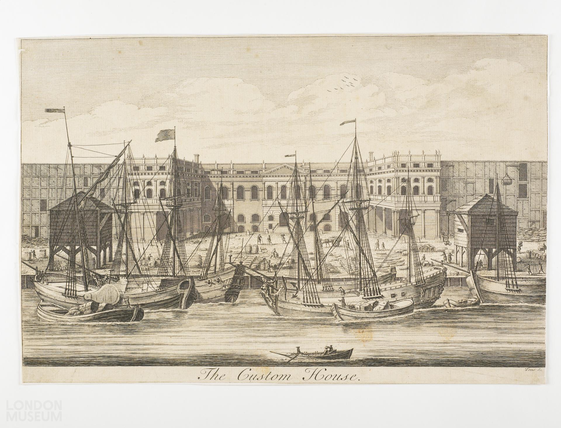The Custom House, rebuilt by Thomas Ripley in 1717-25 on the site of Wren's building (damaged in 1714 by a gunpowder explosion). This building, which burnt down in 1814, was to the east of the present one. It is seen behind the masts of shipping on the river and there are goods laid out on the foreshore for inspection. From Maitland's History of London. Same as A6695 & Z6854.