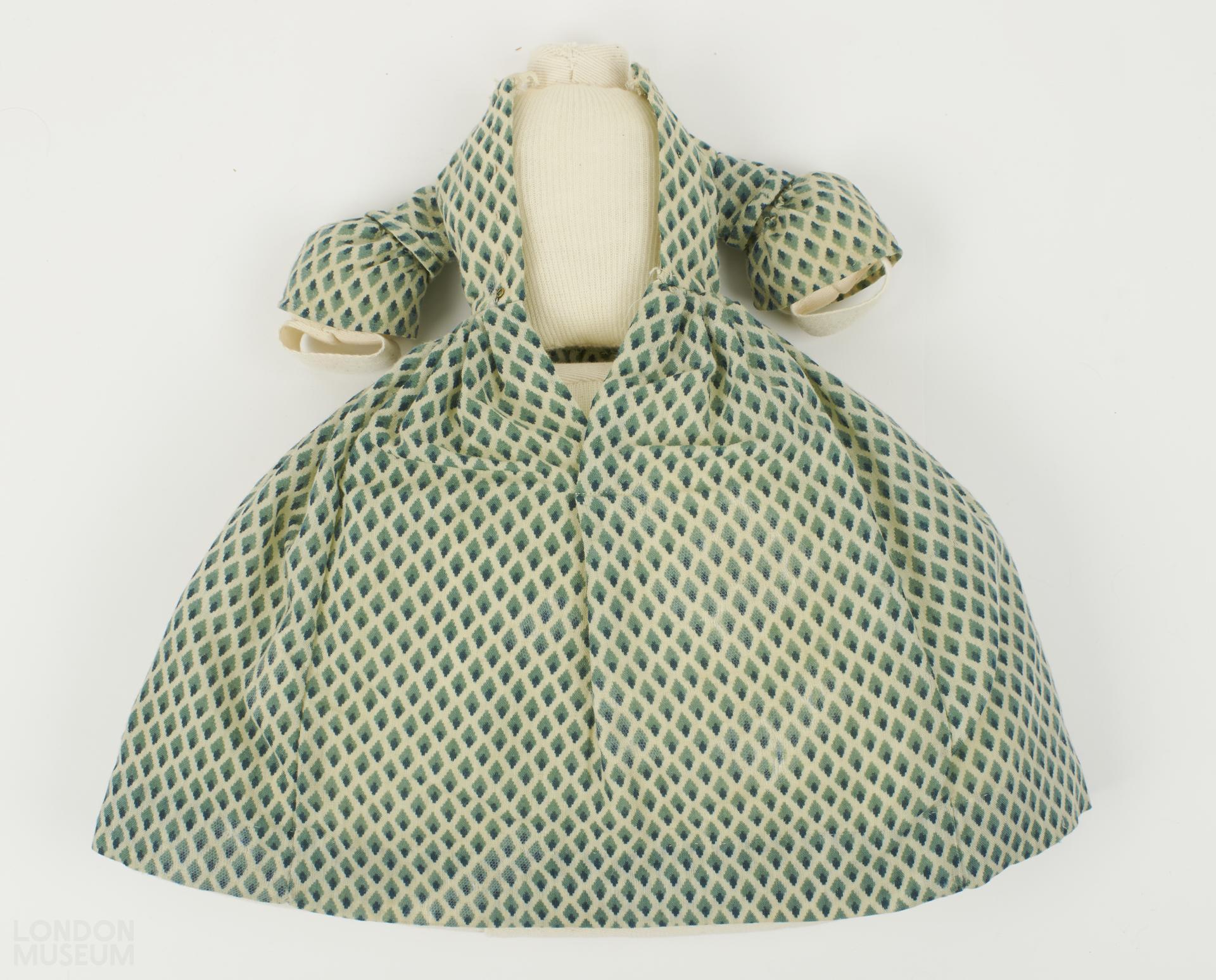 Doll's green and white dress of printed cotton with diamond pattern. Gathered waist and sleeves.