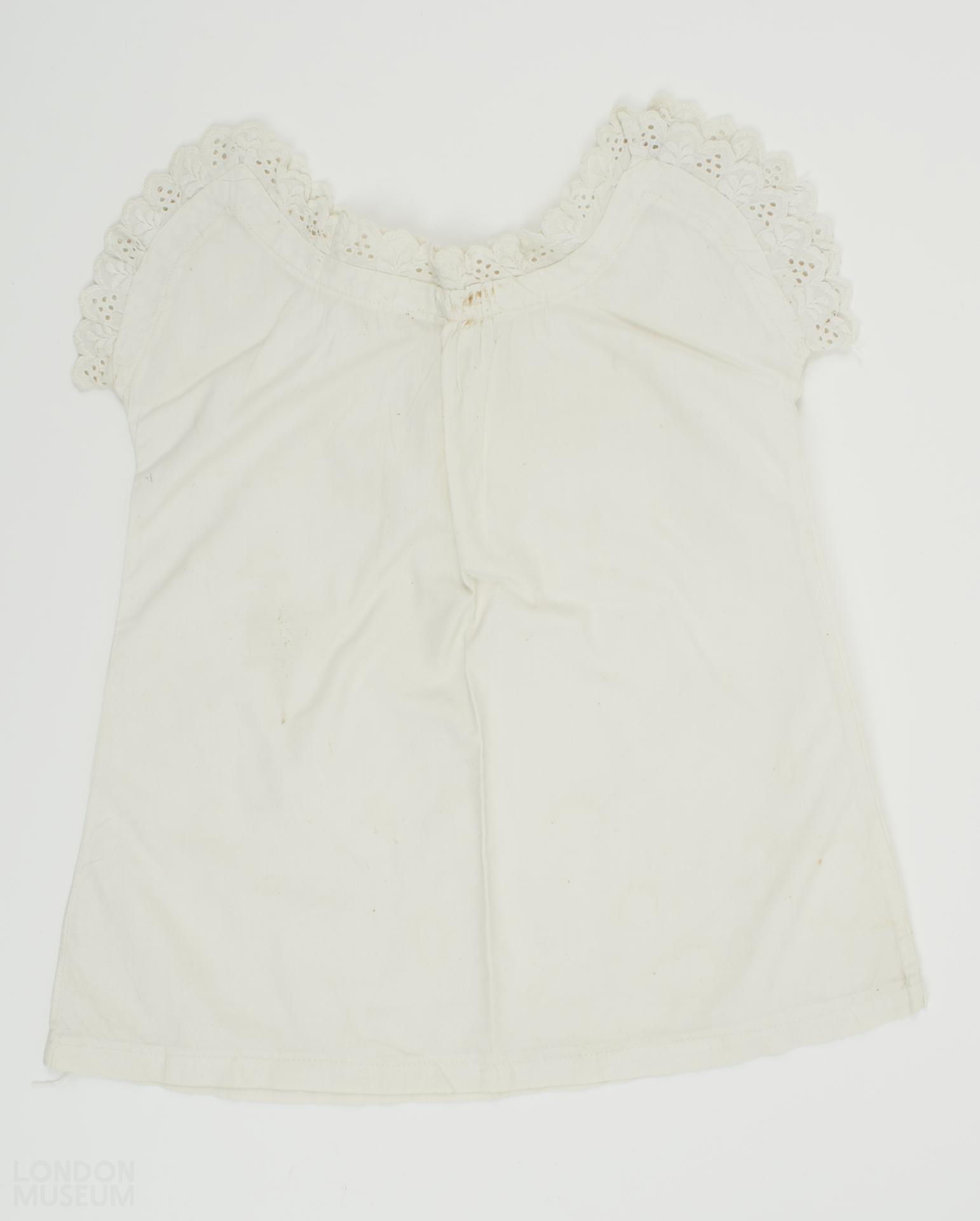 Doll's white cotton chemise. Chemise is decorated around the neckline with cut work (broderie anglaise), and fastens with one button at each shoulder.
