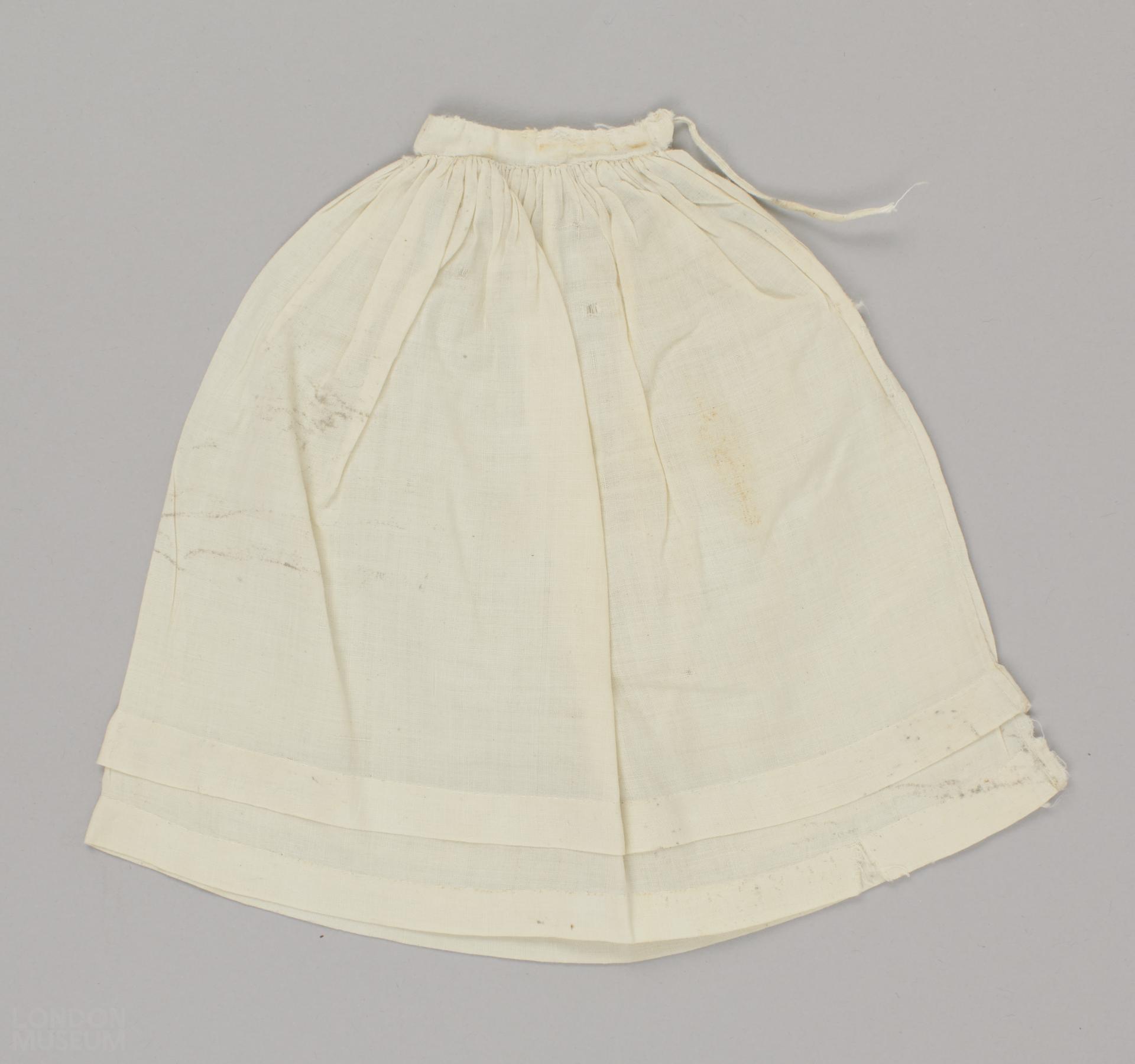 Doll's white cotton underskirt with gathered waist and two cotton ties.