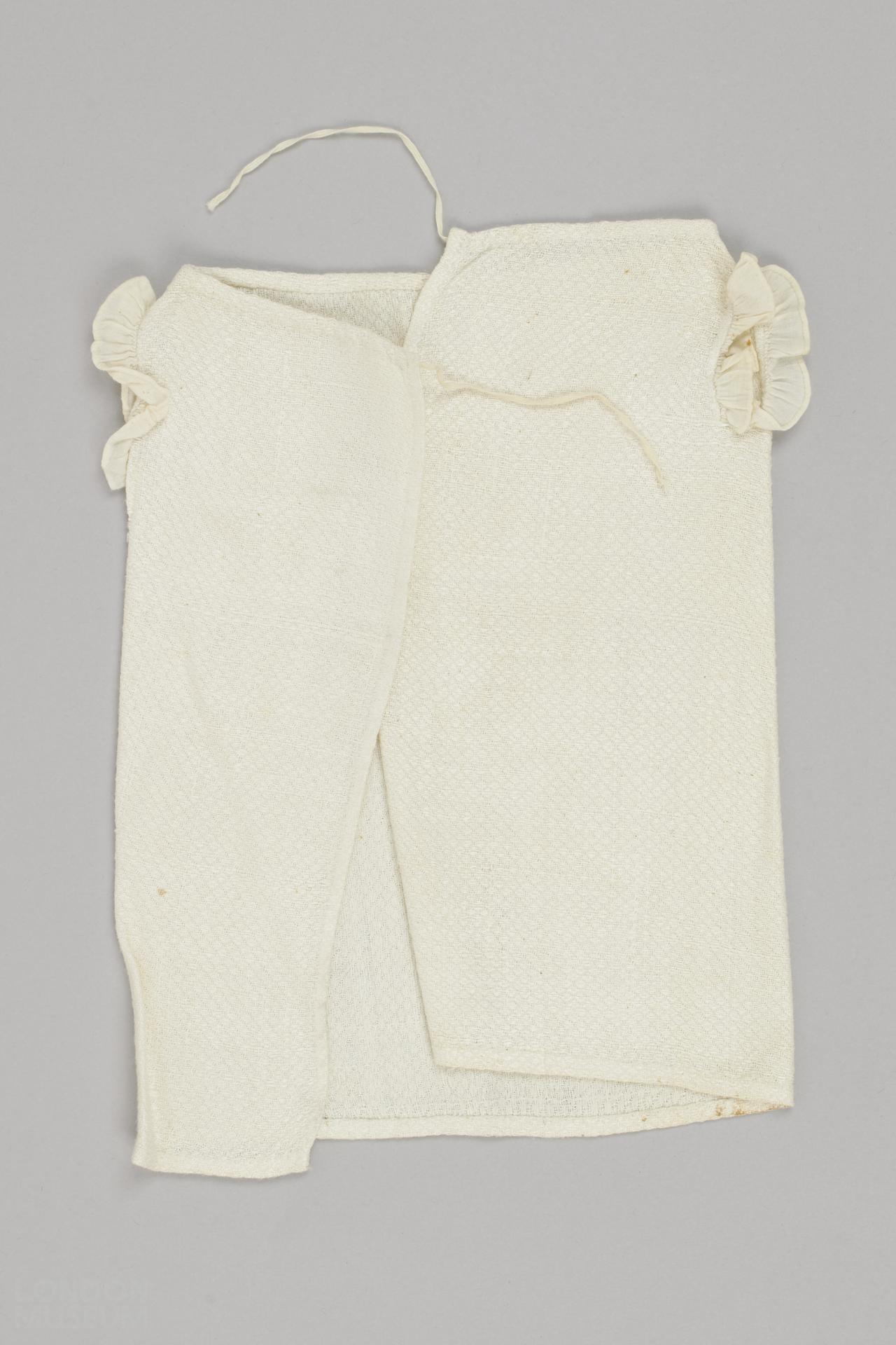 Doll's white cotton chemise made from a cotton and silk fabric woven into a diamond pattern. The chemise features two cotton ties for fastening at the back, with frilled sleeves.