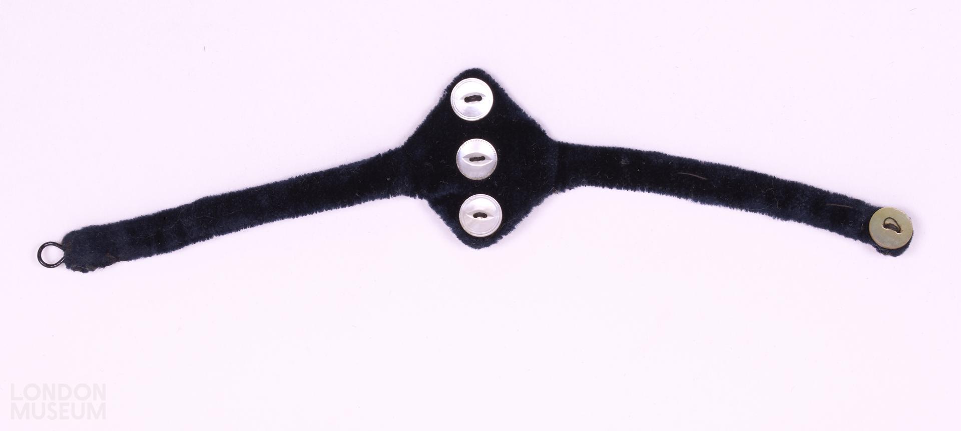 Black velvet belt or waistband for doll's outfit, with three buttons at the front and one at the side all with mother of pearl appearance. Metal hook and eye fastening.