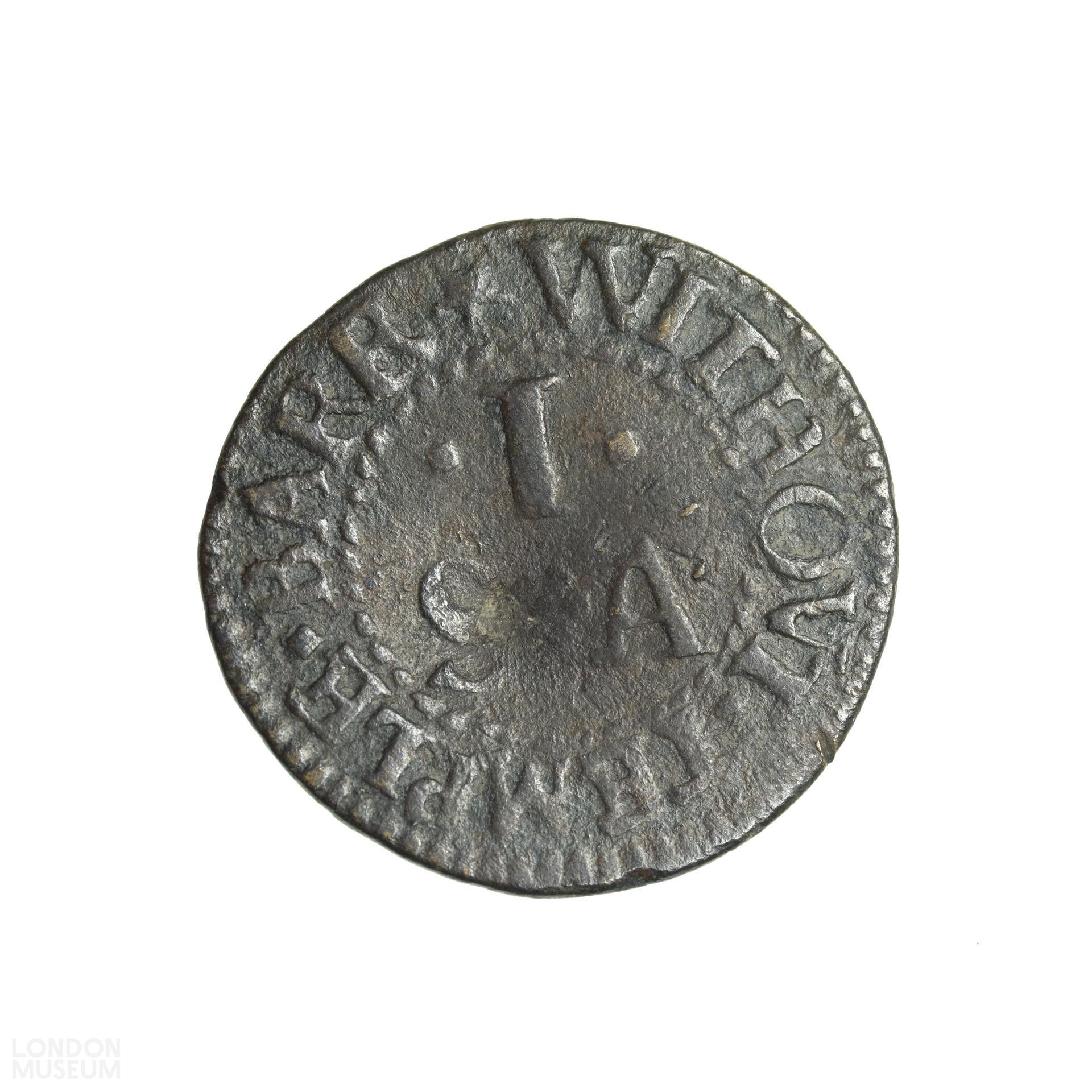 Boyne & Williamson (1889) reference London number 3049. Obv inscription: AT.THE.GOLDEN.FLEECE (around field, in Roman capitals) Device = A fleece (in field); Rev inscription: WITHOVT.TEMPLE.BARR (around field, in Roman capitals) Device = S.A.I. (triad of initials in Roman capitals, in field).