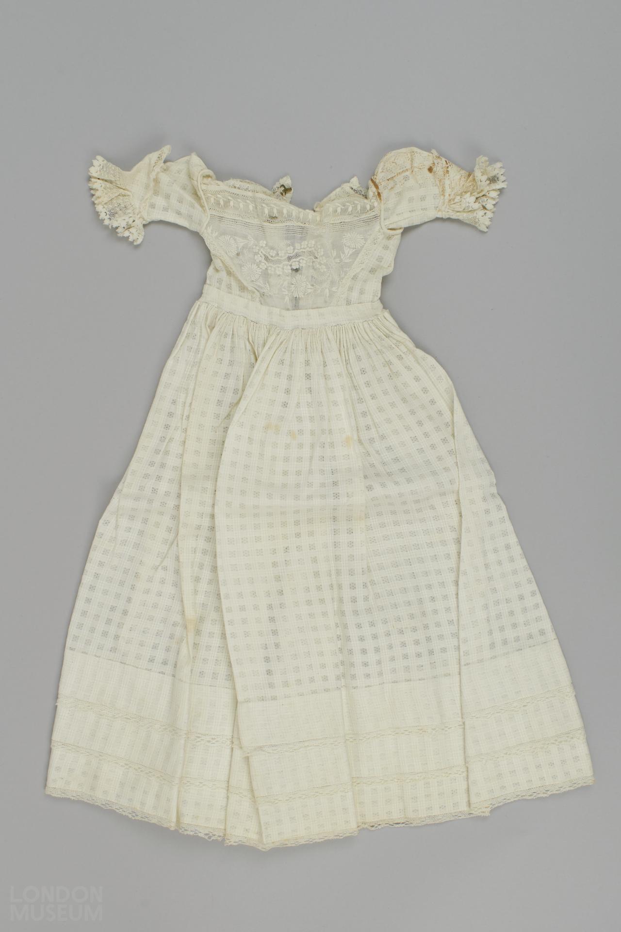 Doll's white cotton dress with sleeves and three metal fastening hooks.The dress has a waist band and the top half of the dress features lace. Brown staining is present.