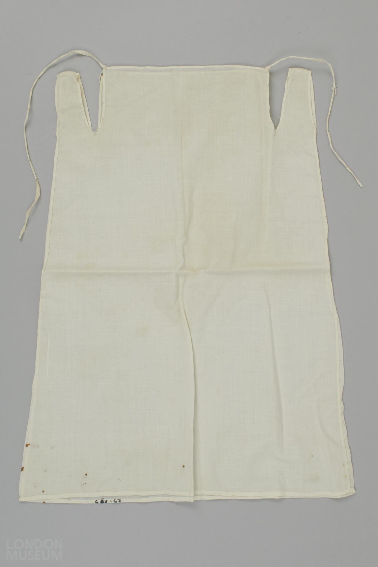 Doll's white cotton chemise with two cotton ties at the top. Brown staining is present.