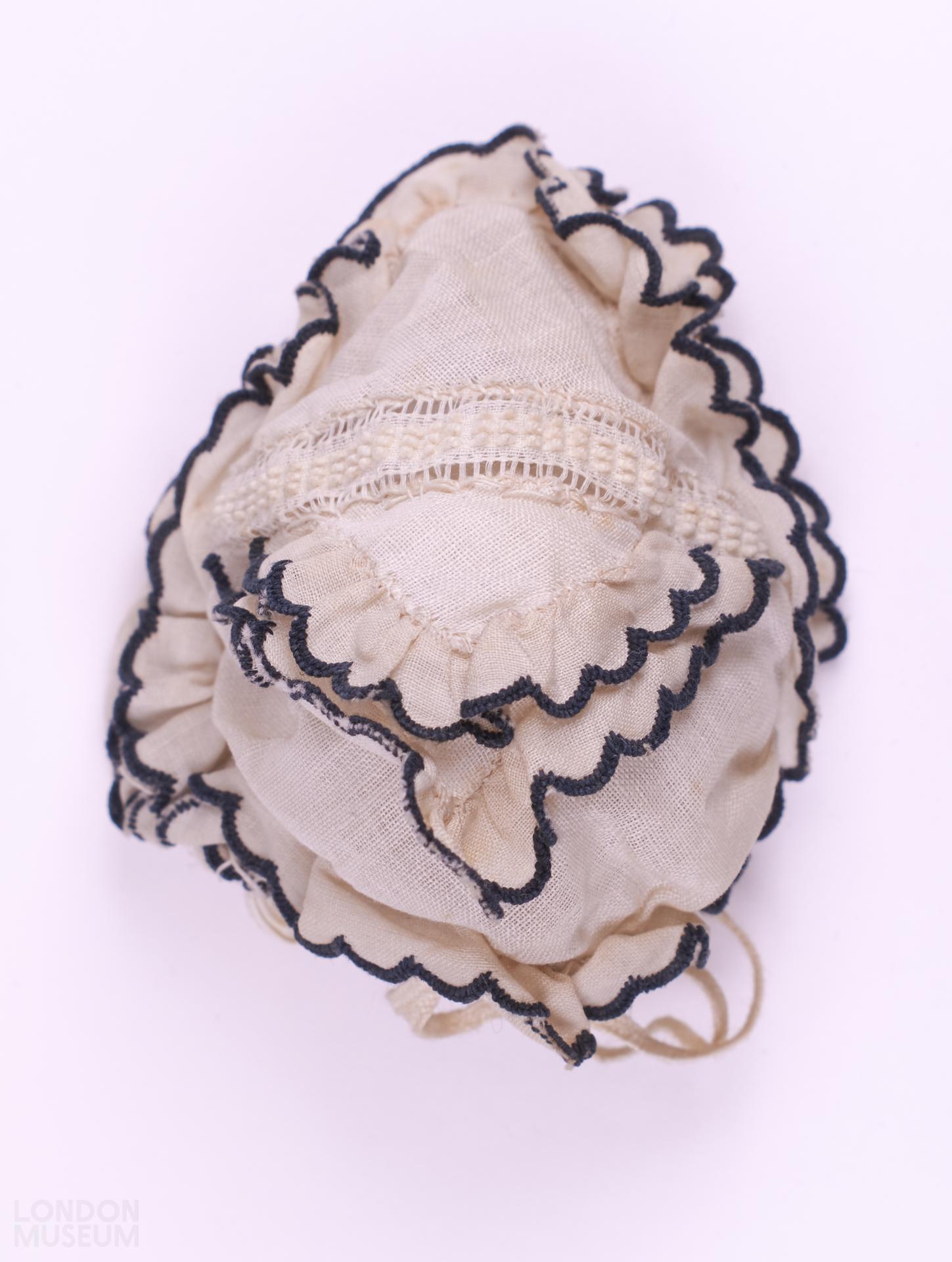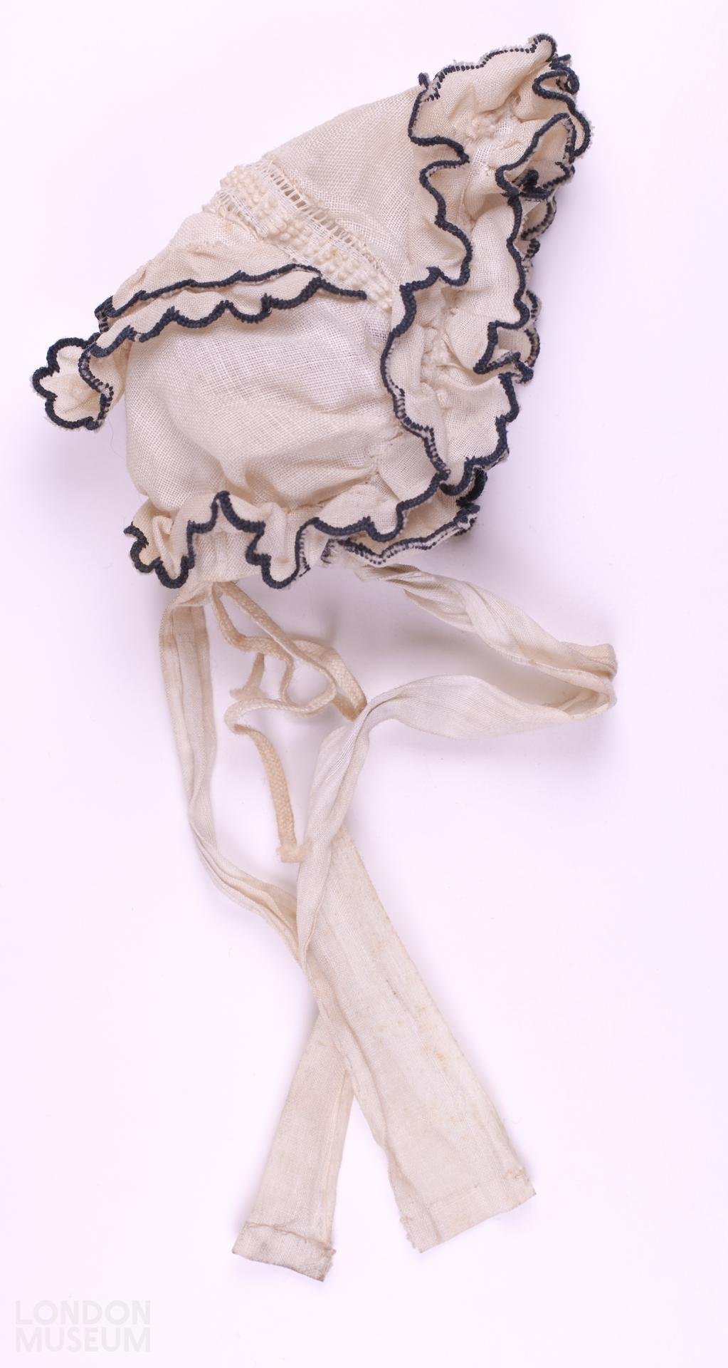Doll's white muslin bonnet with black trim. Long cotton ribbons to tie the bonnet under the chin.