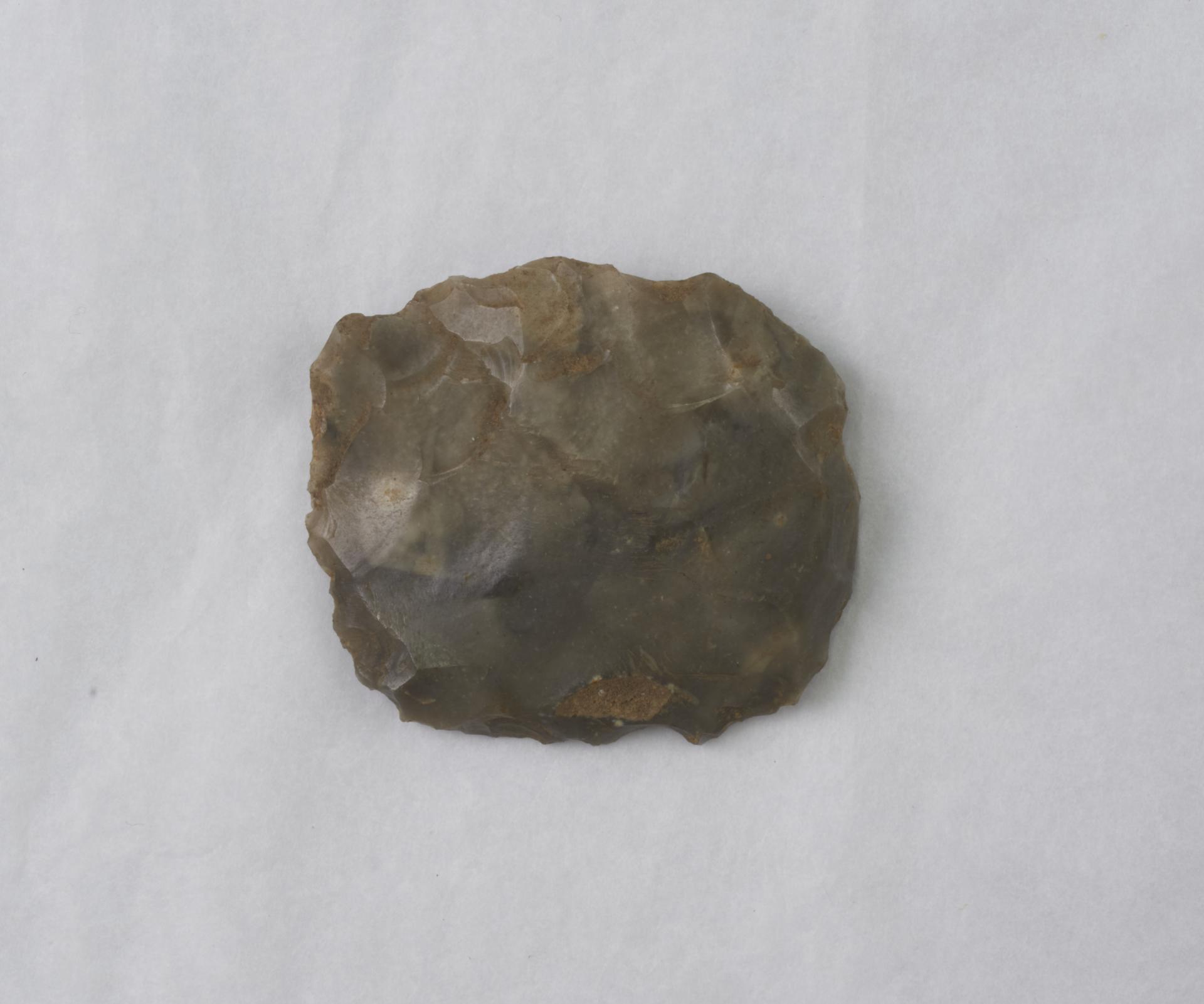 Flint scraper. Roughly square in shape. Grey in colour. Possibly an end scraper. Distal end has been retouched.