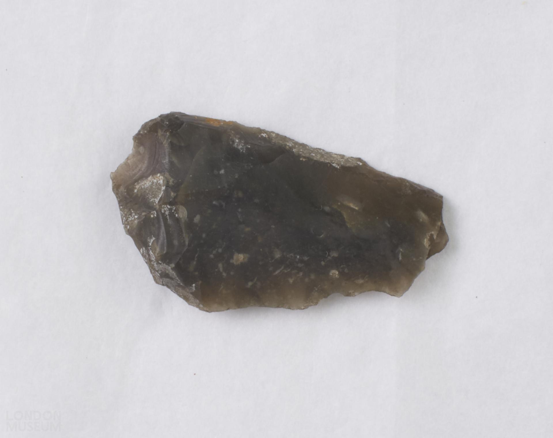 Brown flint flake, labelled 'London Wall, Roman, 1905'?.
