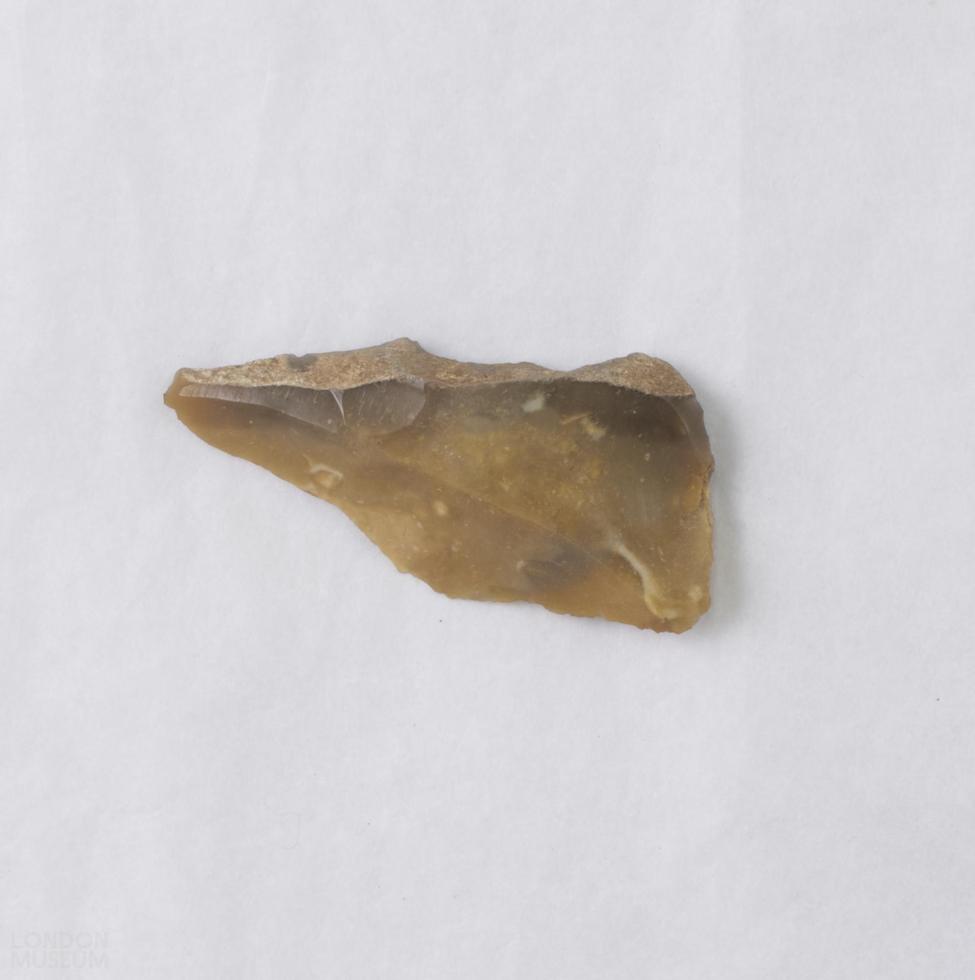 Yelow / ochre flint flake, marked 'Dollis Hill 1928 H J Quilter', with a sharp point.