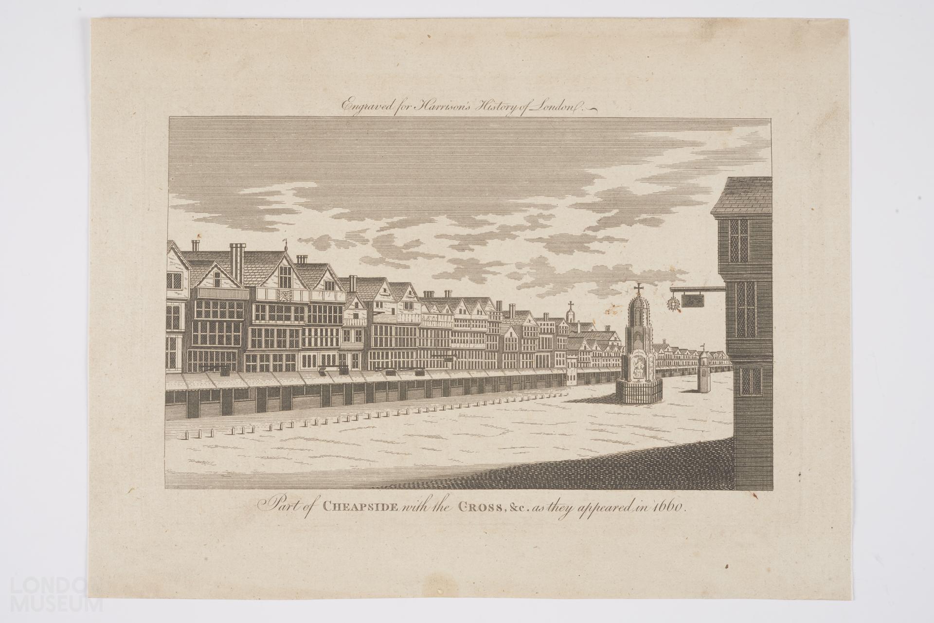 Cheapside and Cheapside Cross 1660. Harrison's History of London was published c.1770/75 but this may be from a later edition or separately reprinted. The Cross was built in 1290 by order of Edward I to mark one of the resting places of the coffin of his queen Eleanor. It was three storeys high and decorated with statues of the Pope, the Virgin and Child and the Apostles. In the 16th Century it was constantly attacked by Puritans until finally demolished in 1643 by workmen, protected by soldiers, 'to cleanse that great street of superstition'. The cross appears in the engraving, although it is said to show the market in 1660. 'Chepe' means 'market', and there is a long line of small lock-up shops against the tall houses on the far side of the street.