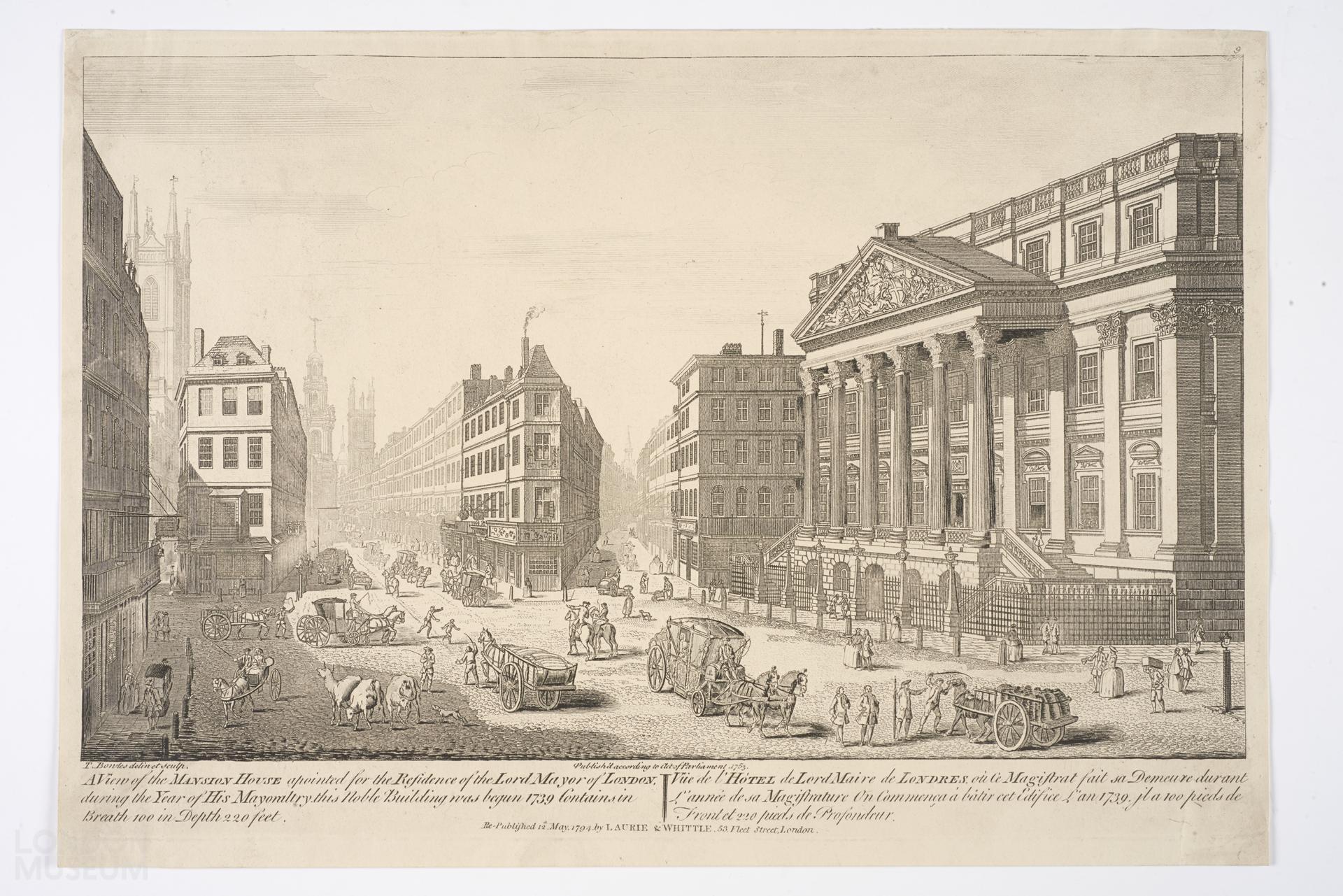 Completed in 1753 after a design by George Dance the elder (1741-1825) the Mansion House was positioned in the heart of the City to provide a permanent residence for the Lord Mayor of London. This view shows the Palladian Mansion House on the right and looks towards Cornhill on the left and Lombard Street. The tower of the Royal Exchange can be seen on the left. This view was originally produced by successful engraver and print publisher Thomas Bowles, to capitalise upon the current interest in the new building. It was produced in 1751 ( and the collection has a complementary copper engraving of the same view also produced in 1751 by Bowles ( 53.52/13)) before completion of the building . It has a deliberately enhanced perspective which lent itself to future reproduction as a ‘perspective view’ to be viewed through a specially made optical diagonal machine. This gave the appearance of three-dimensionality in a print