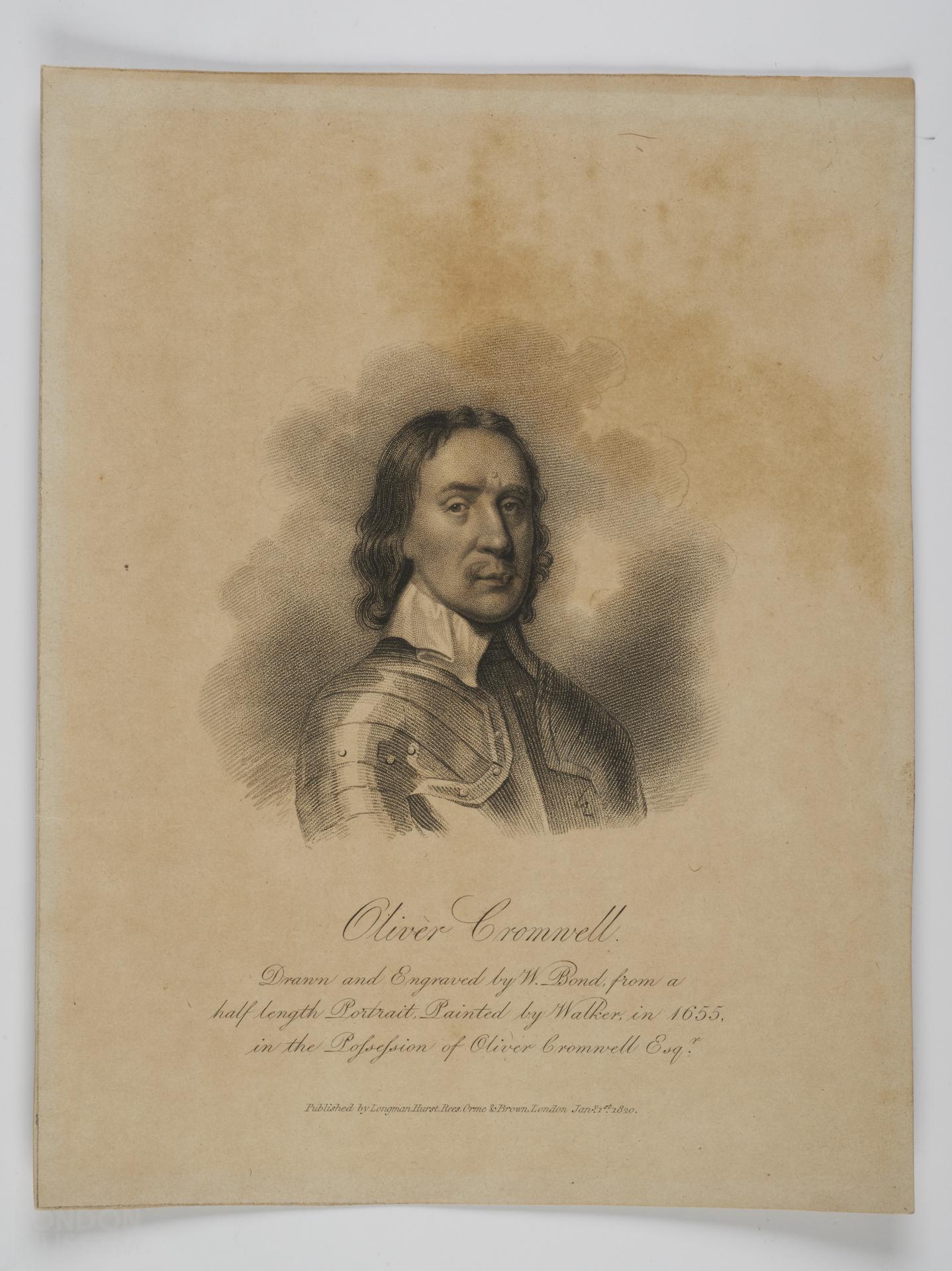 Portrait of Oliver Cromwell, with details beneath of the artist, engraver and publisher.
