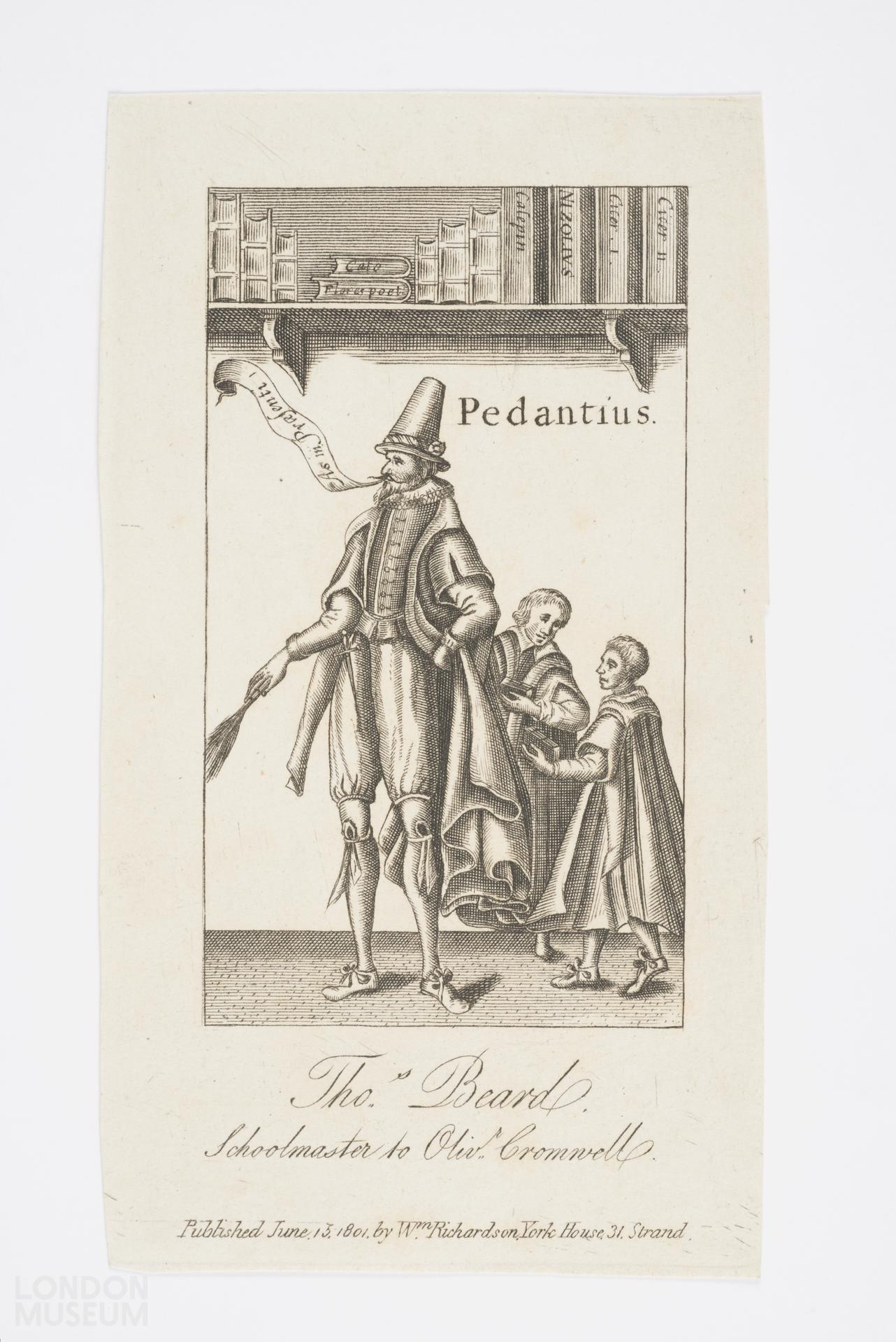 Thos Beard, Schoolmaster to Olivr Cromwell. Beard (c.1568-1632) was a virulently anti-Catholic Church of England clergyman and author, reputedly from Huntingdon, where he became master of the free school in 1604 wher Oliver Cromwell was later to be a pupil. He is shown standing before a high bookshelf with heavily bound volumes ("Cicer I, Cicer II, Nizolius, Calepin, Cato, Florespoet[?]") with two schoolboys behind him, all dresed in flowing cloaks. He says (in a speech banner) "As in Praesenti".